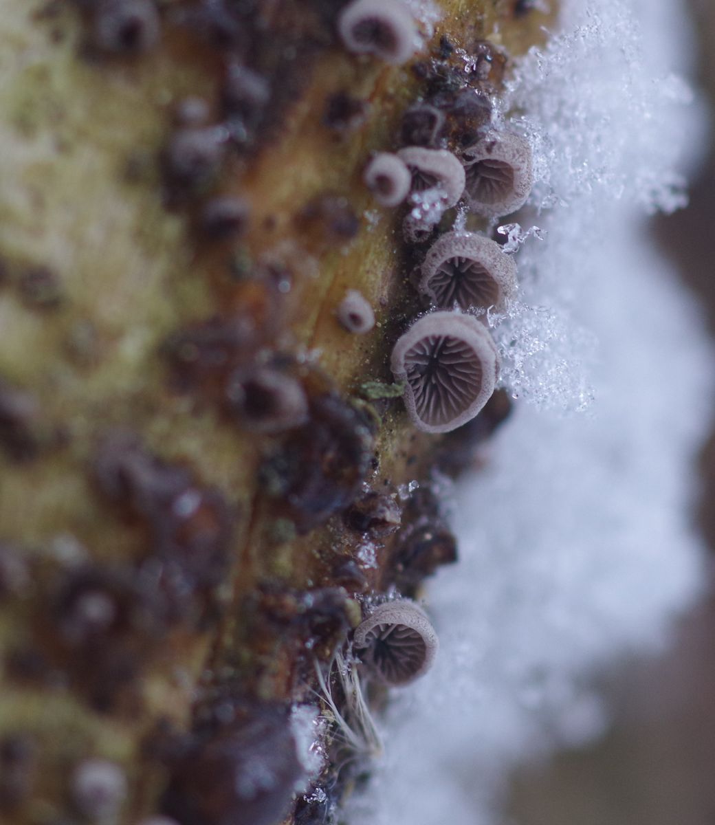 gestern habe ich an ziemlich morschem Roten Holunder (S. racemosa), ohne Rinde, aber noch stehend, in etwa 1 m Höhe einen kleinen dunklen Seitling gefunden, bis 3 mm im Durchmesser, neben bzw. unter der aktuellen Kollektion ist auch noch die vorherige Generation in dunkel und schrumpel zu sehen