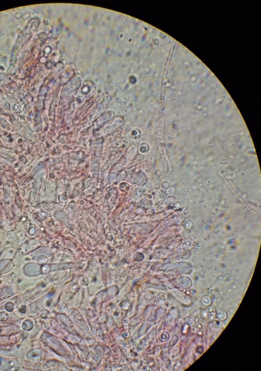 in Kongorot, keulige Basidien (4-sporig), evtl. etwas schmalere Teile als Cheilozystiden. Die Sporen sind rund, ~5 µm, meist mit Tropfen,