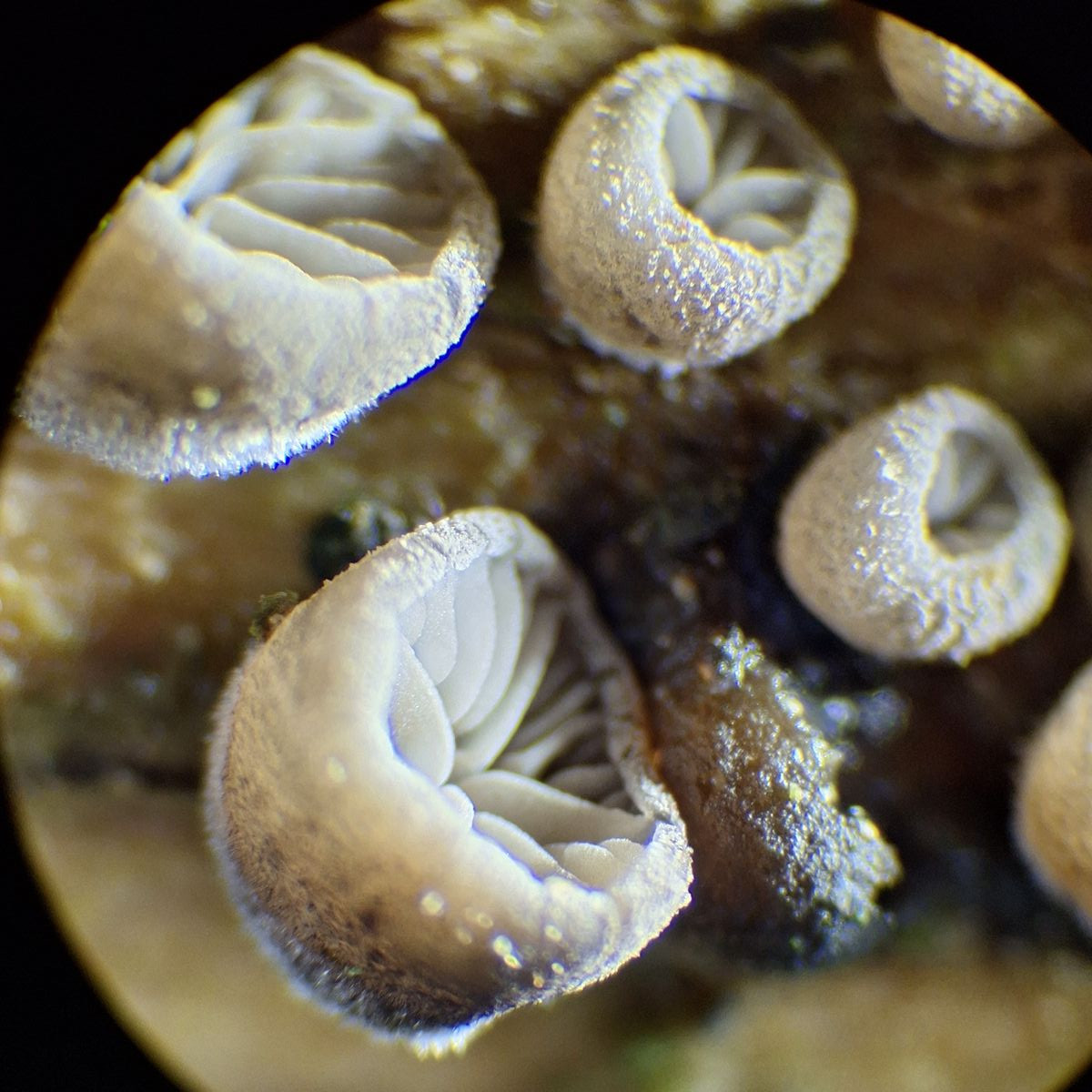 Meine Pilze sehen deutlich anders aus als der von Christoph, zunächst die Sporen, ebenso fehlen bei mir die aufgefingerten Hyphen. R. trichotis schließe ich hier natürlich auch aus, der hätte ja oberseits deutlich schwarzes Fell wie hier Zwergseitling