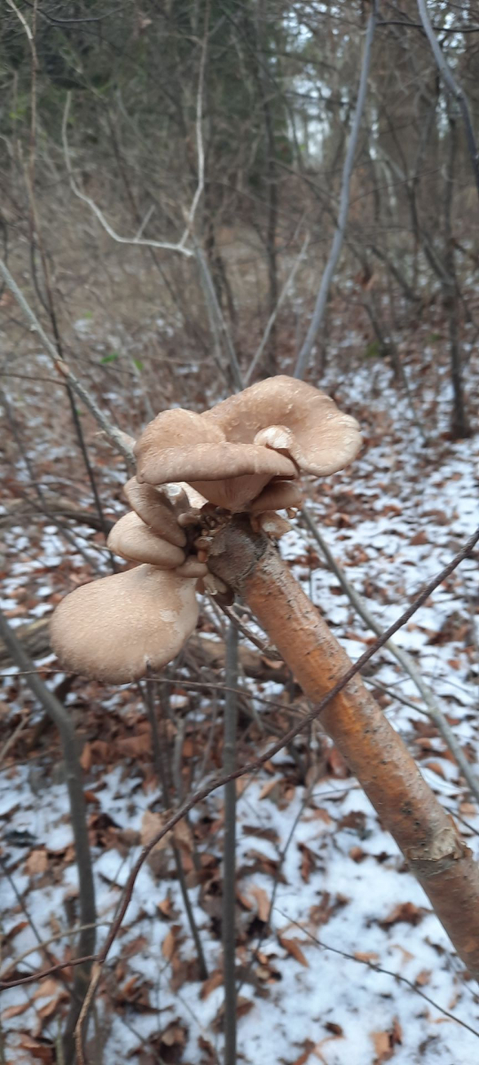 Zunächst die Austern: Toter dünner Baum, ich denke Buche, ca. 1,30 Meter über dem Boden, 2 Meter vom Weg entfernt. Die Lamellen wirken auf dem Foto brauner als sie sind: sind eher weiß-gräulich mit leichtem Braunstich. Geruch: leicht pilzig