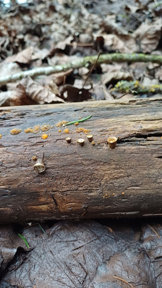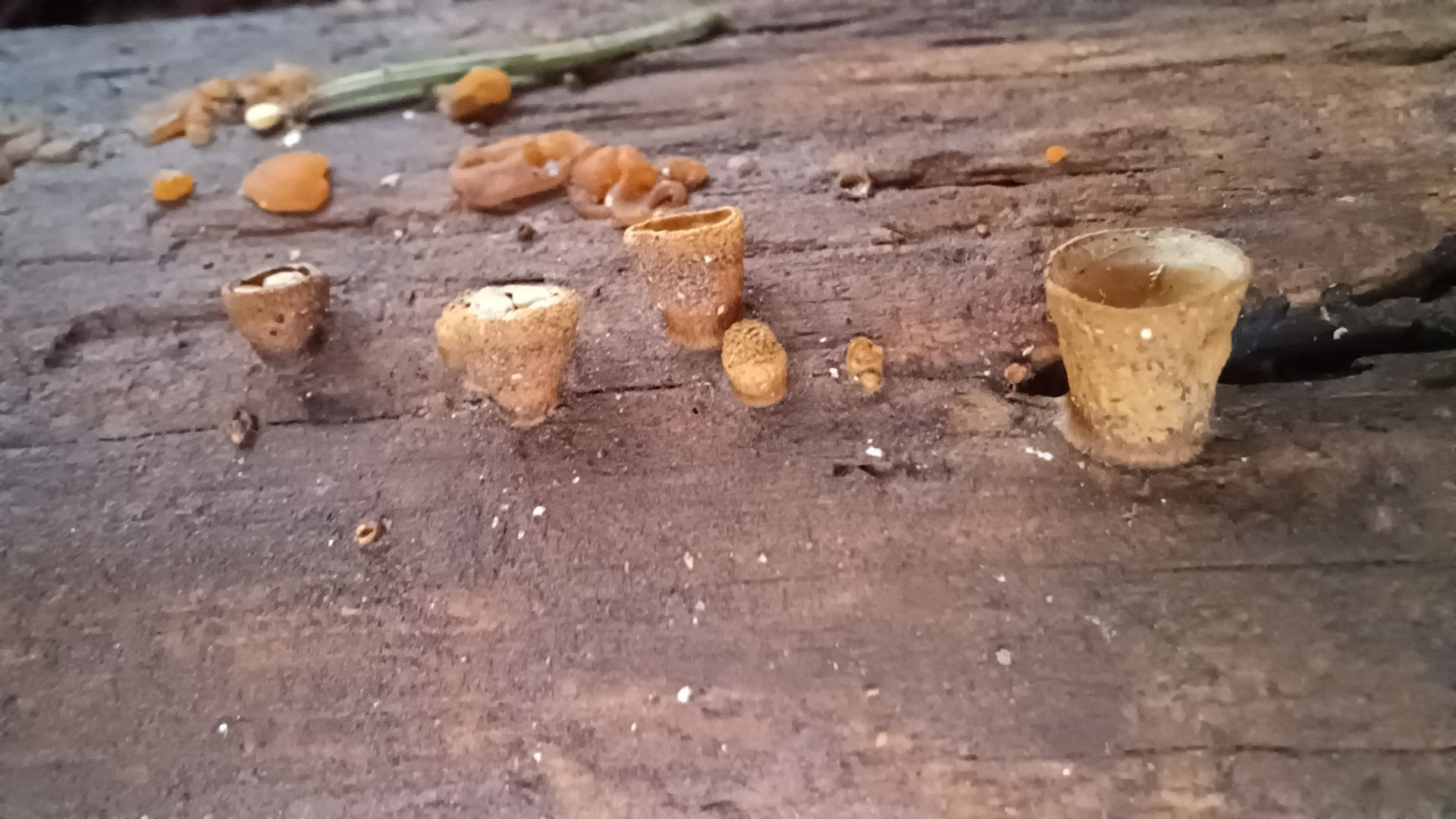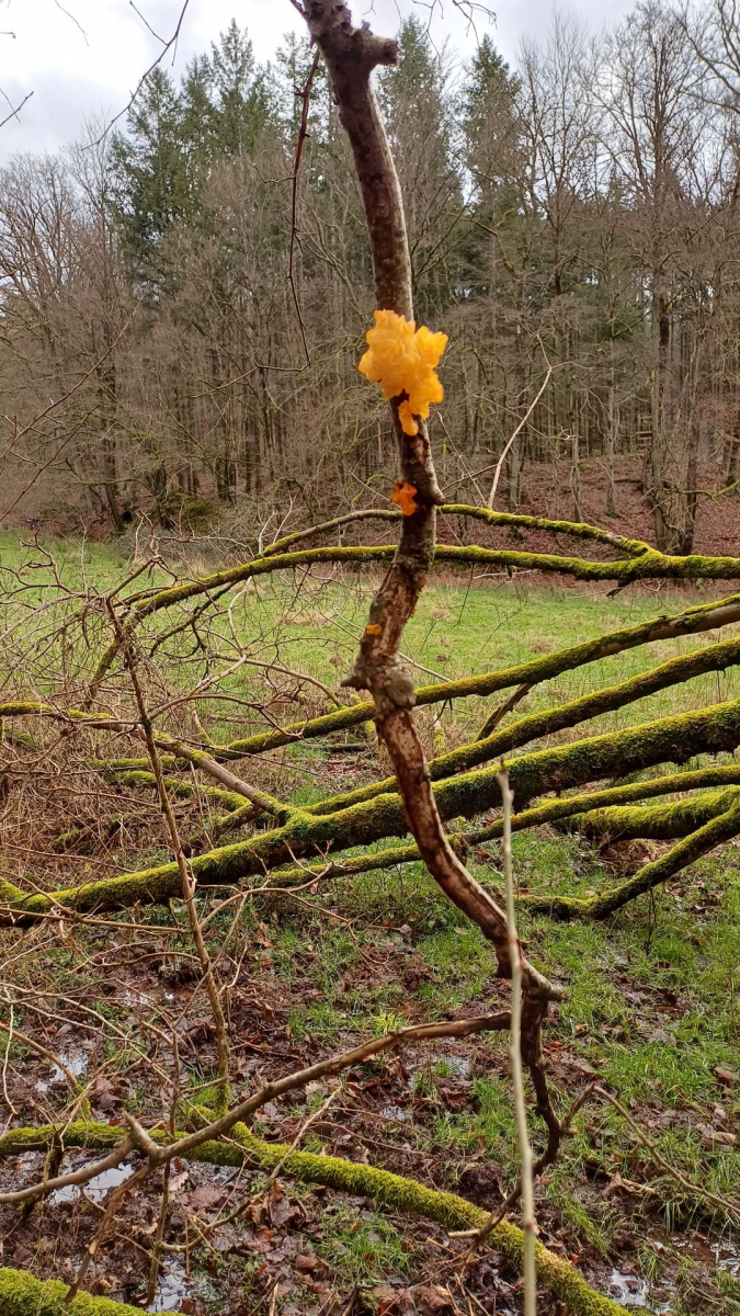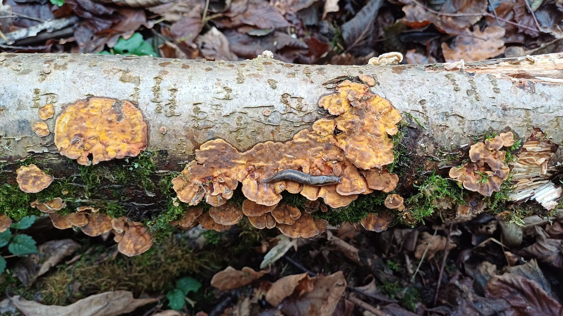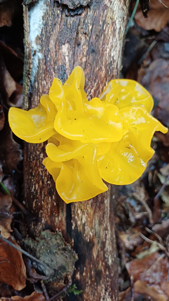 Und Futter für Pilze, die Pilze futtern, so wie der Goldgelbe Zitterling, der an Rindenpilzen parasitiert.