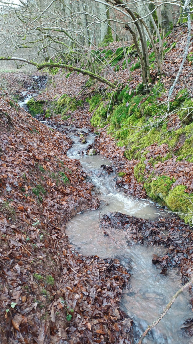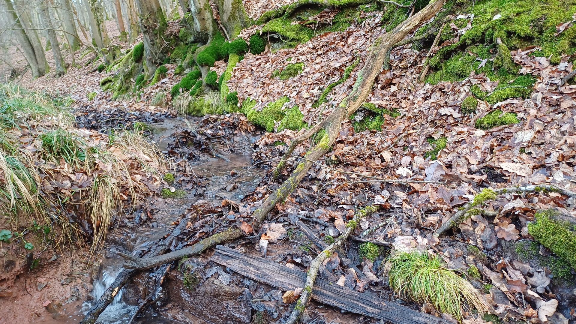 Der Quell-Bach fließt am Rand des Nordhanges entlang.
