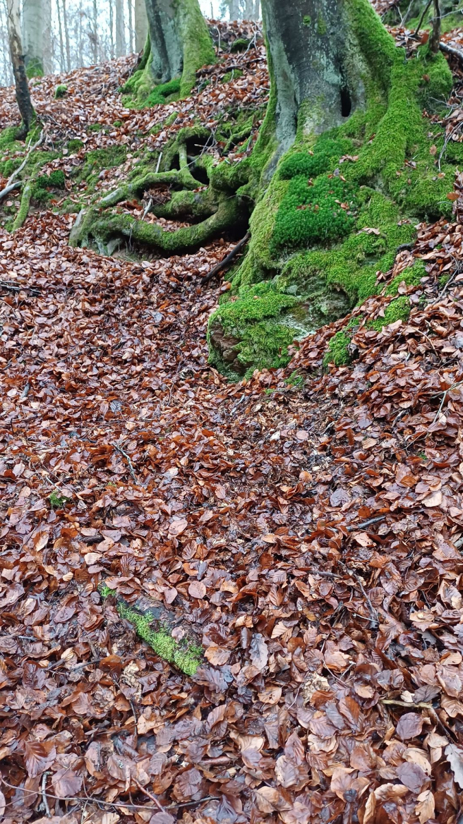Der trockene Südhang ist von Kiefern, Hainbuchen und Buchen bewachsen, die aber zum Teil abgängig sind. Totholz im Mengen.
