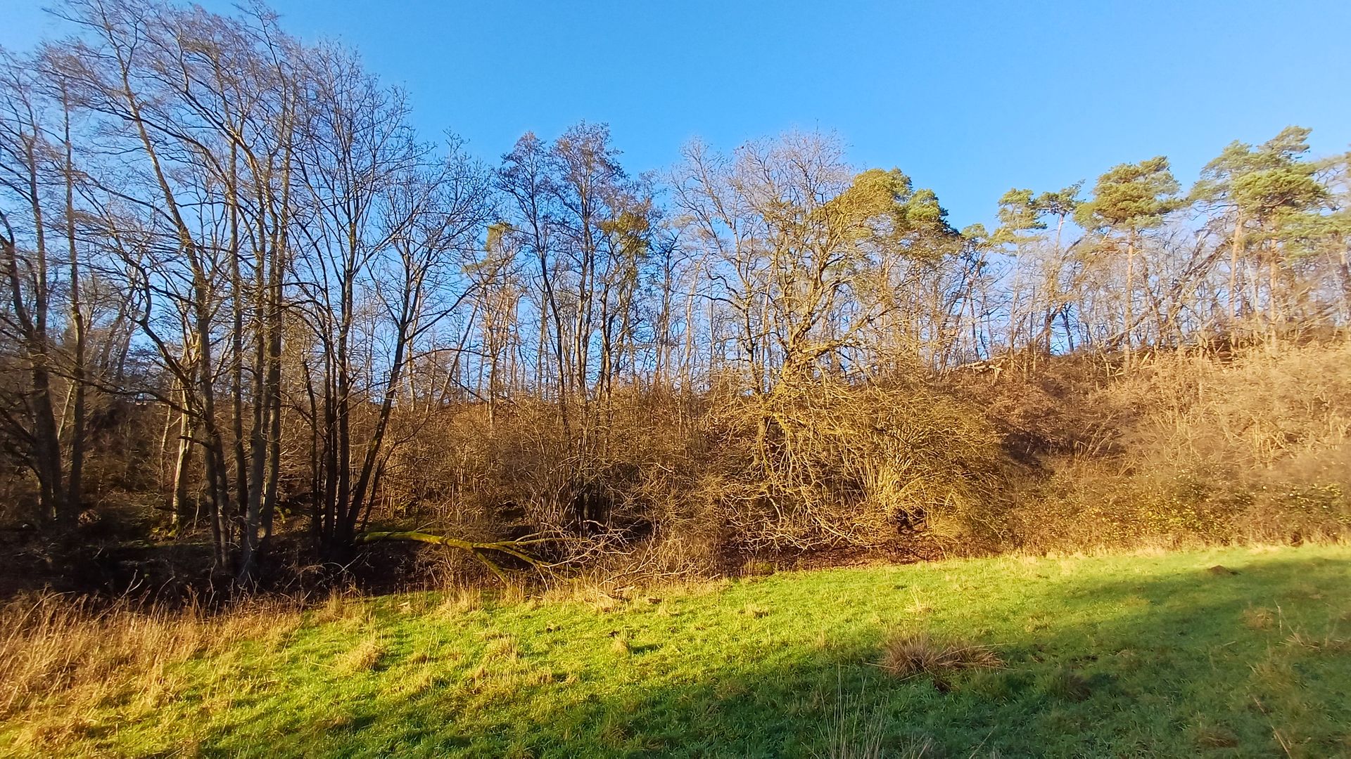 Wenn man durch den feuchten Wiesengrund auf die andere Talseite wechselt, kommt man zu einem Totholz reichen Strauchsaum.