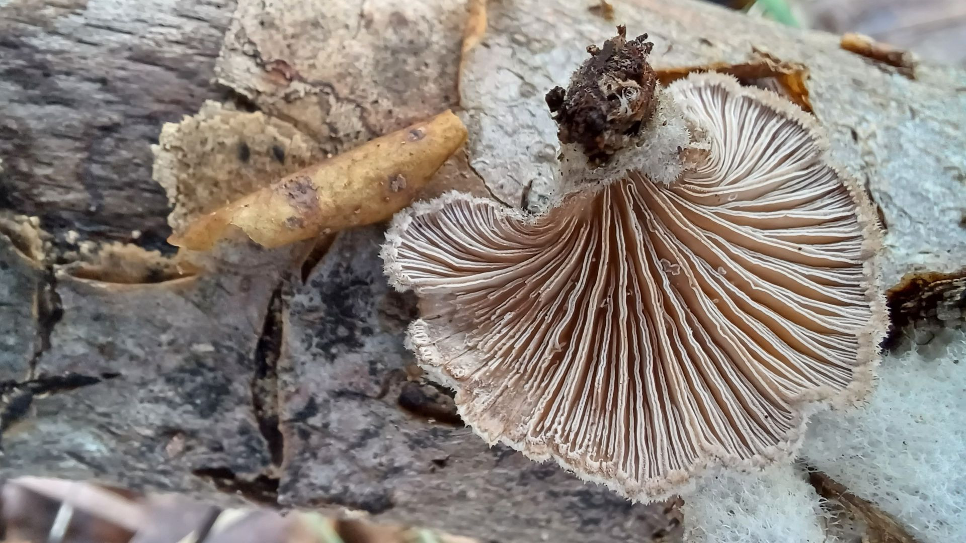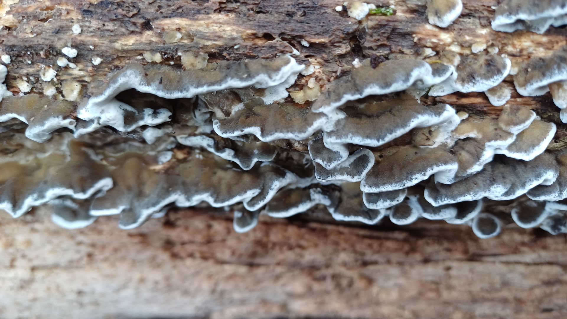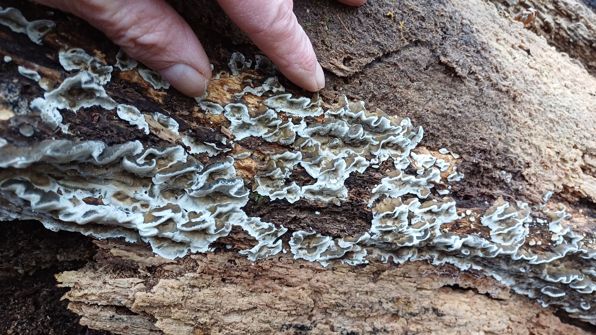 Wohl ein resupinat wachsender Schichtpilz, Stereum spec.