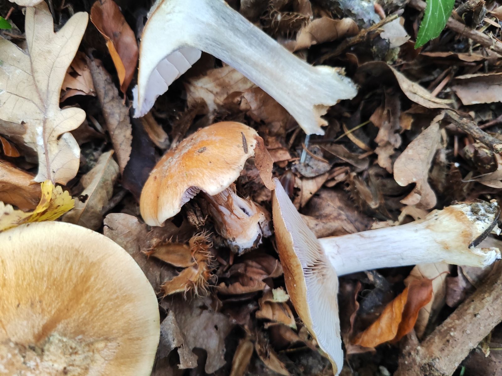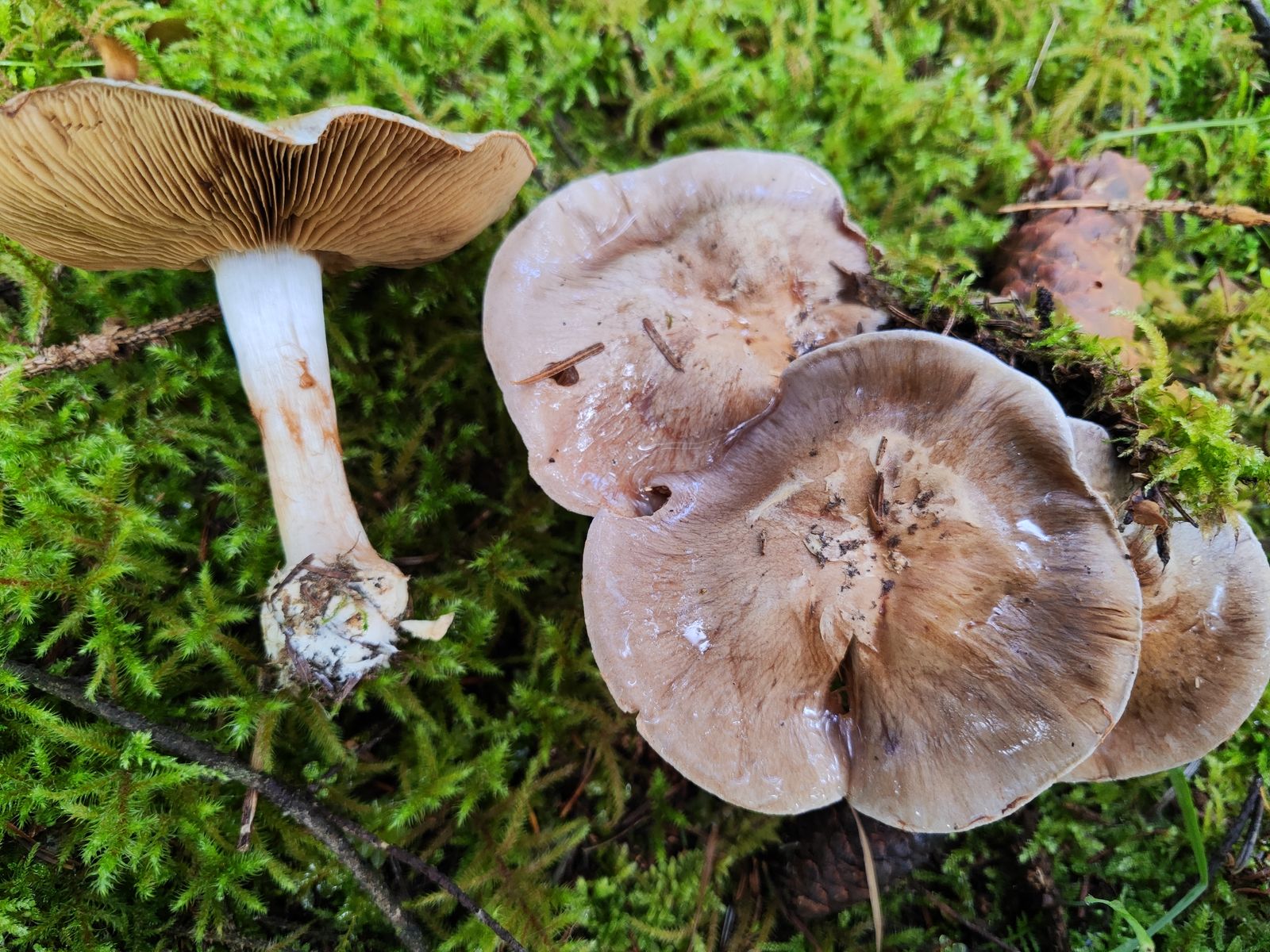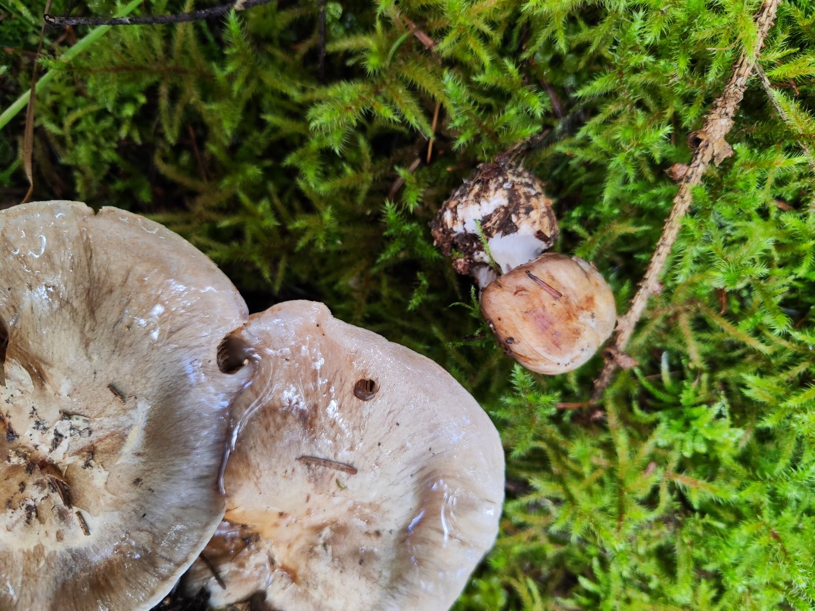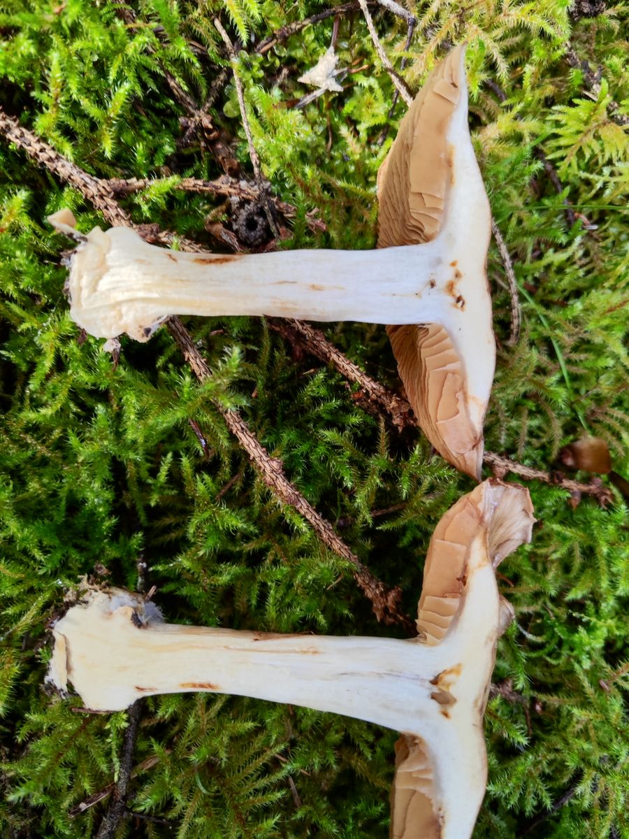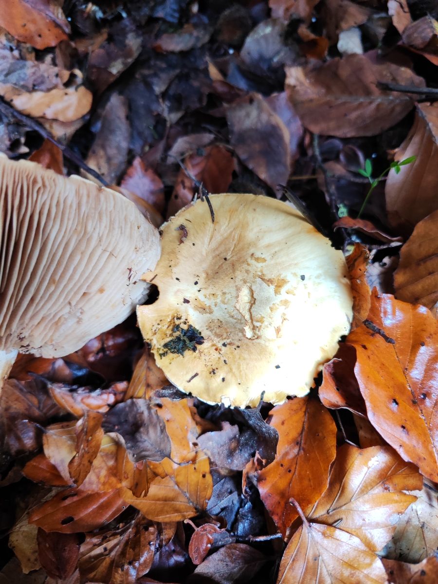 1. Der erste ist aus dem reinen Kalknadelwald bei Fichte und Tanne in der Nähe weiterer interessanter Phlegmacien wie C. aureofulvus, C. odorifer, C. terpsichores und mehr. Ziemlich ungewöhnliche Färbung, vor allem das junge Exemplar, Geruch und KOH unauffällig. Der kleine stand in allernächster Nähe zu den großen aber ich bin mir nicht mal ganz sicher ob der dazu gehört. Ich hab mir C. caesiocanescens angeschaut und auf iNaturalist meinte ein Cortinarius-kenner mal mit dem zu vergleichen. Der scheint auch irgendwo zu passen, allerdings finde ich recht wenige Fotos, die auch noch teilweise recht unterschiedlich aussehen zu der Art