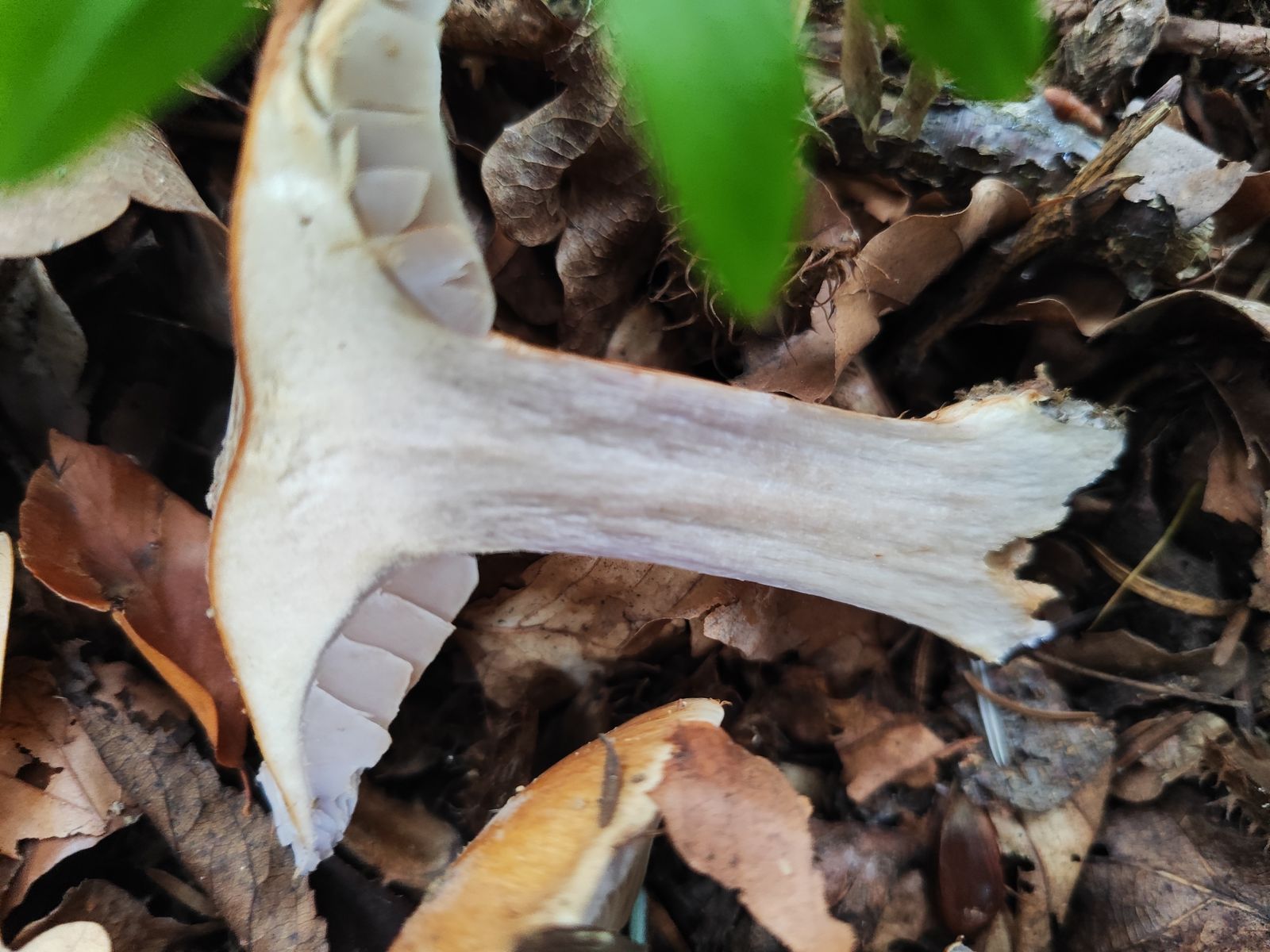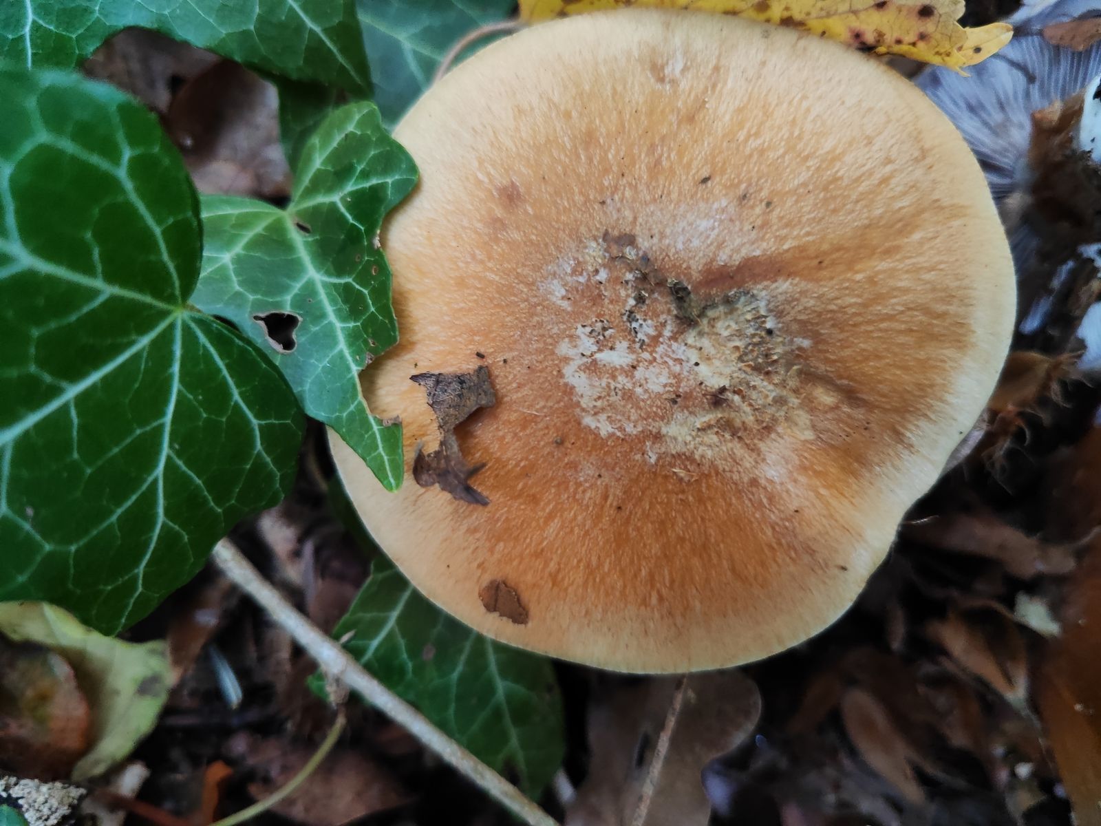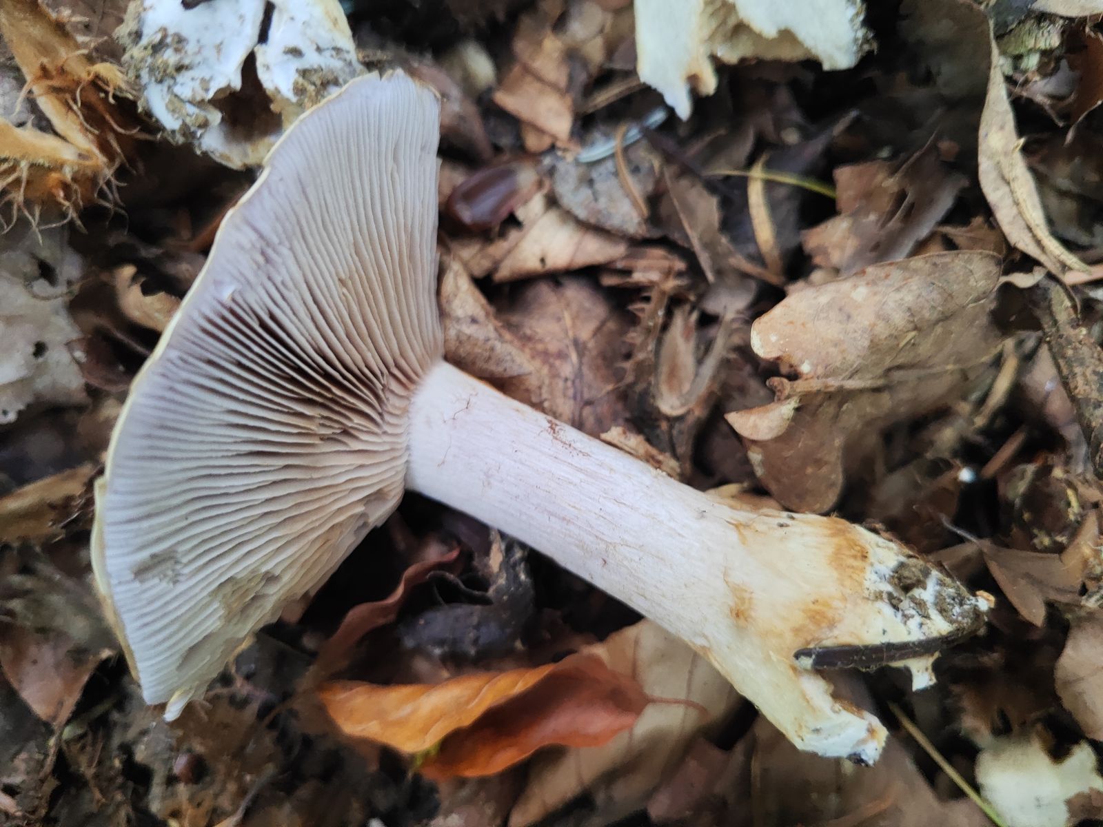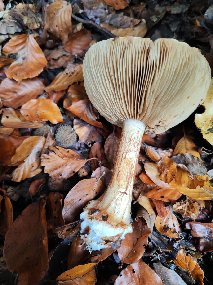 2. Einer aus dem selben Wald, direkt aus Kalkschotter, hier auch Fagus in der Nähe. Leider kein Jungexemplar, KOH leicht rotbräunlich. Velum recht auffällig, mit blassen Gelbtönen aber komplett ohne Violett, Knolle ziemlich breit, das sollte ein Calonarius sein oder?