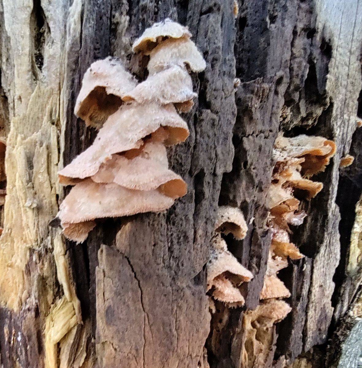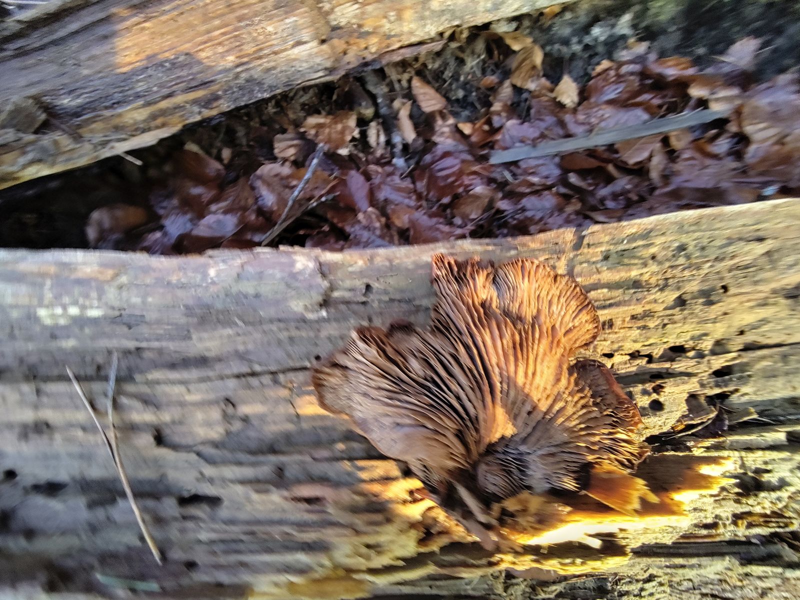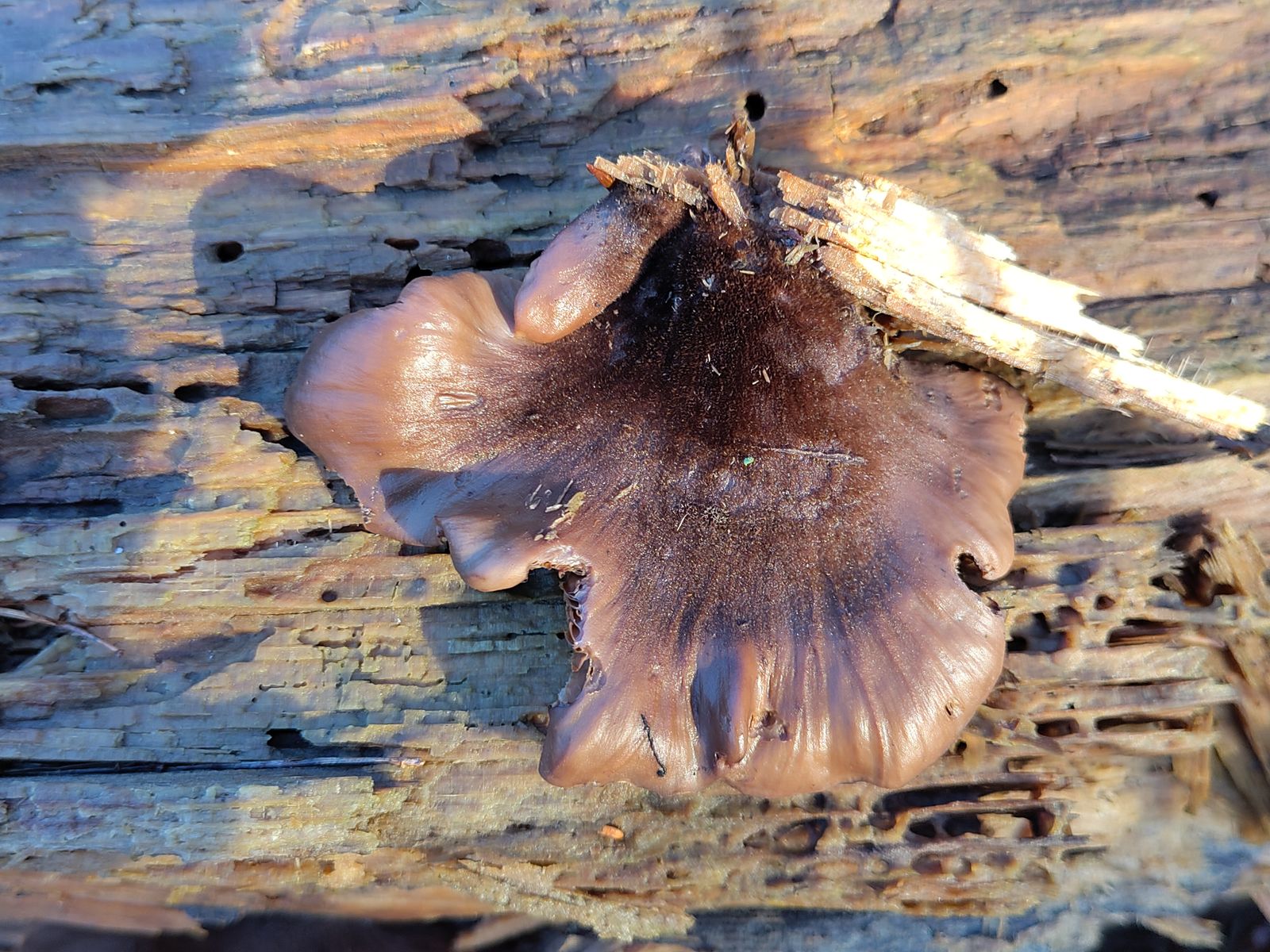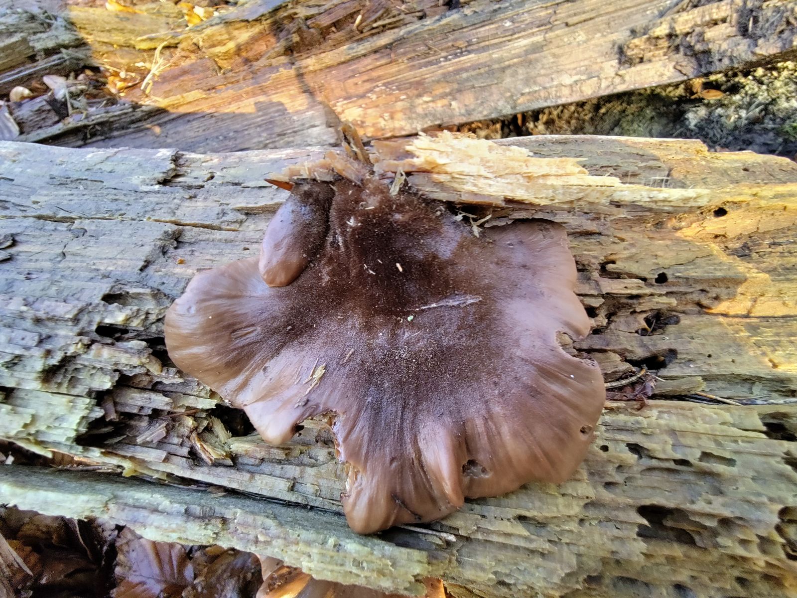 Die runzlige Oberfläche spricht für den Runzelhütigen Zähling Lentinellus vulpinus. Lentinellus castoreus Filziger Zähling oder Lentinellus ursinus Geschichteter Zähling würde ich aufgrund der filzigen Hutmitte aber nicht komplett ausschliessen. Wie seht ihr das? Kann man dazu noch was sagen oder sind die Fruchtkörper zu alt?