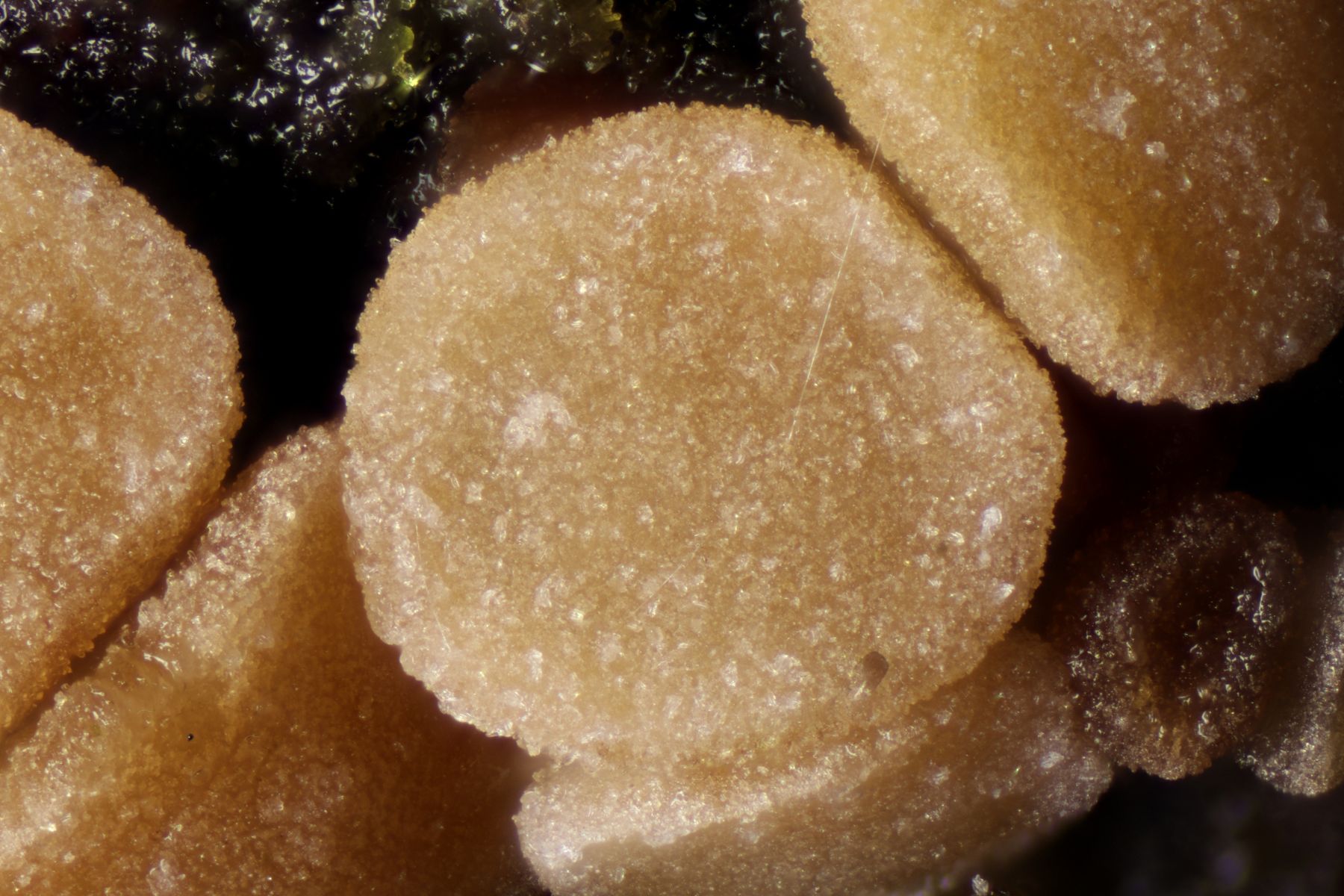 Mittlerweile gab es sogar noch einen weiteren Pinus strobus Pilz: Ich hatte einige abgestorbene, mit Meloderma desmazierii befallene Nadeln mit nach Hause genommen und in eine feuchte Box gegeben. Da wuchs dann als Parasit auf der Meloderma noch Sirotrema translucens: