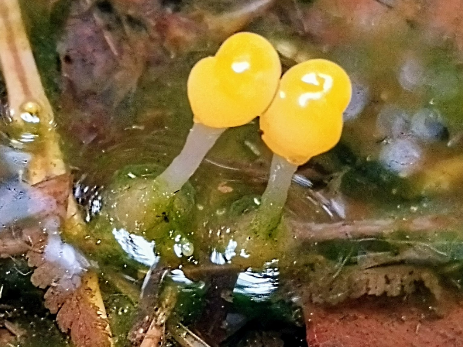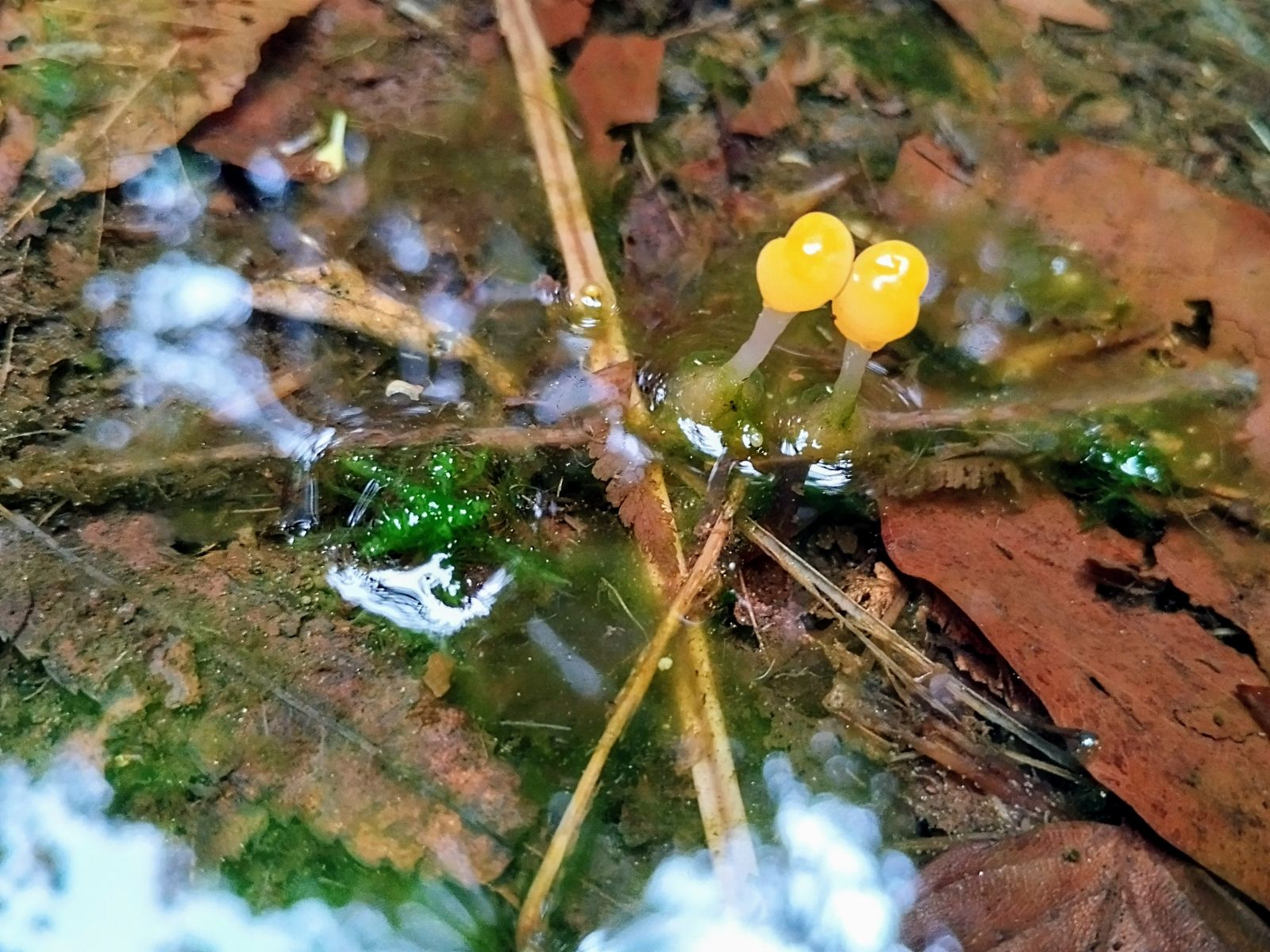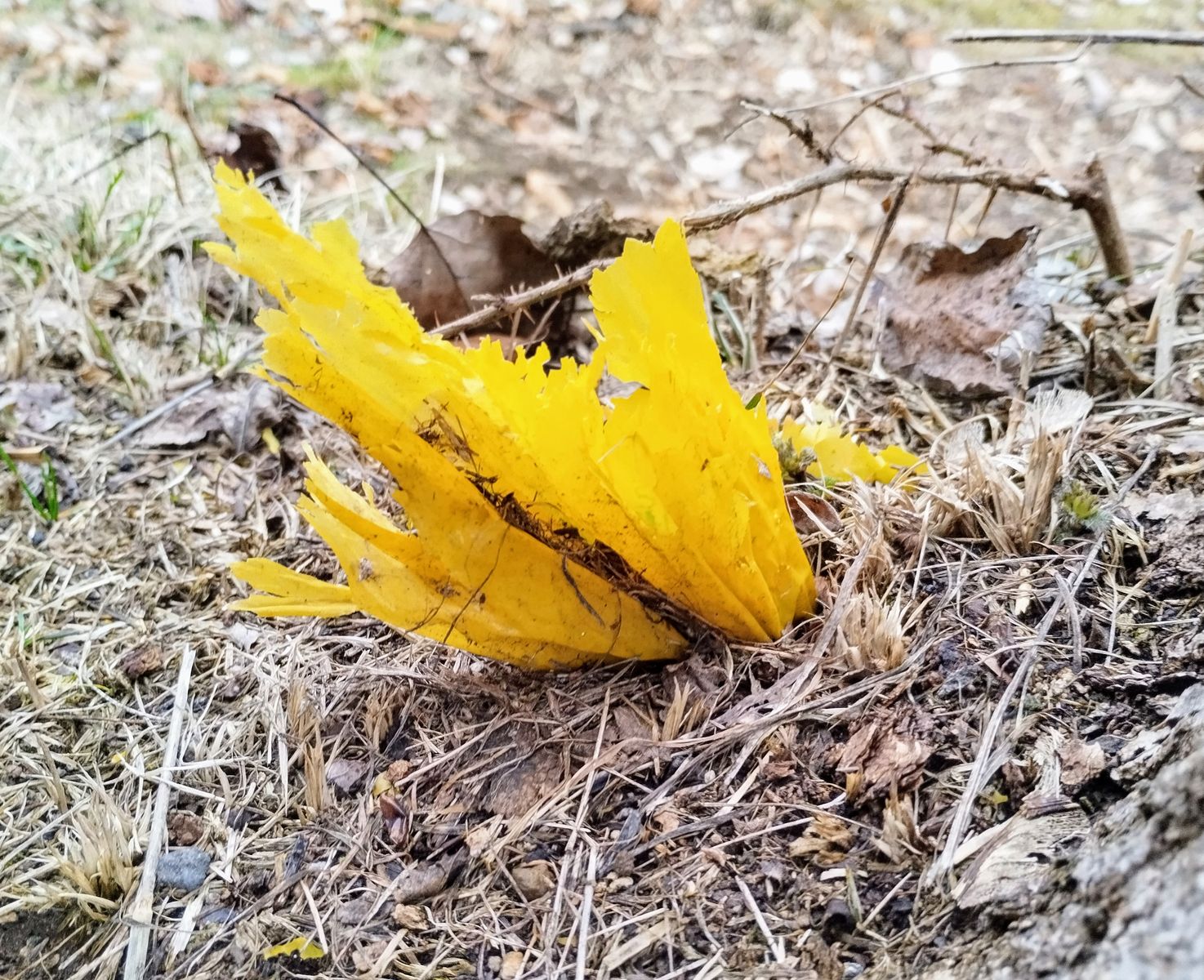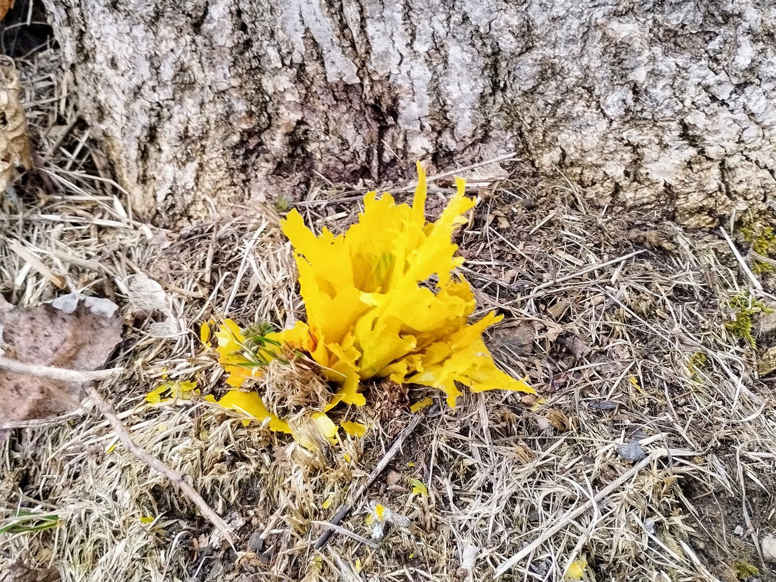 Mittlerweile bin ich schon im Februar angekommen. Wieder bei einer Wanderung konnte ich plötzlich etwas knallgelbes am Fuße eines solitären Baumes entdecken. Von der Form her irgendwas korallenartiges. Das aber bei Frost mitten im Februar? Sehr unwahrscheinlich.