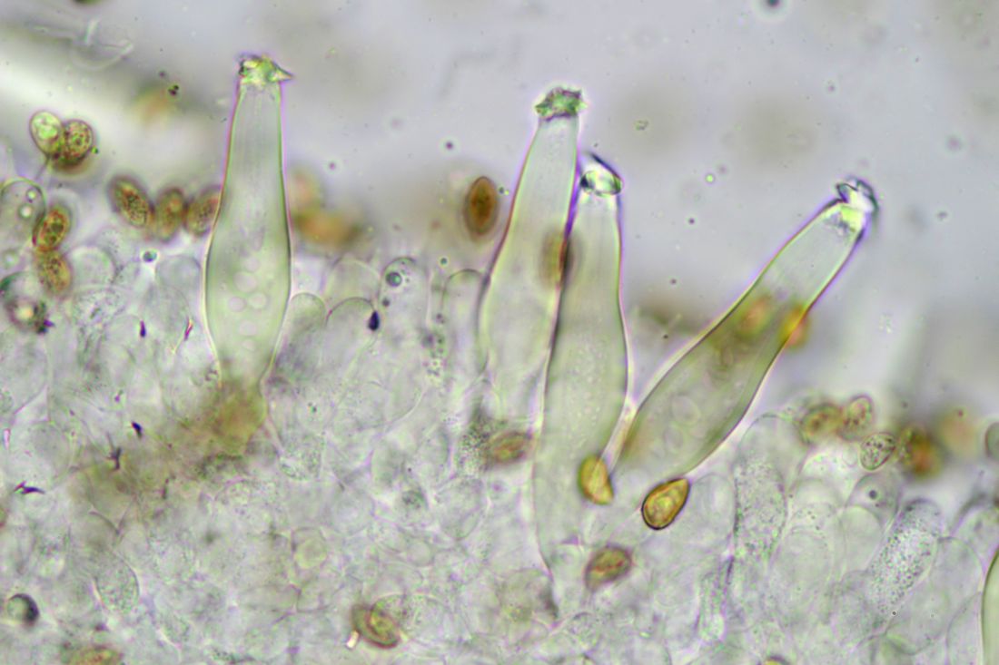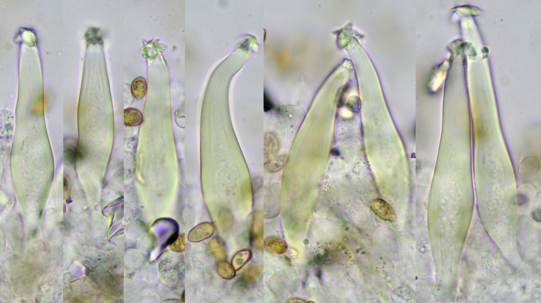Kaulozystiden sehr lang, den gesamten Stiel bis unten überziehend. Beim größten Exemplar auf den Makrofotos auch zu erkennen.