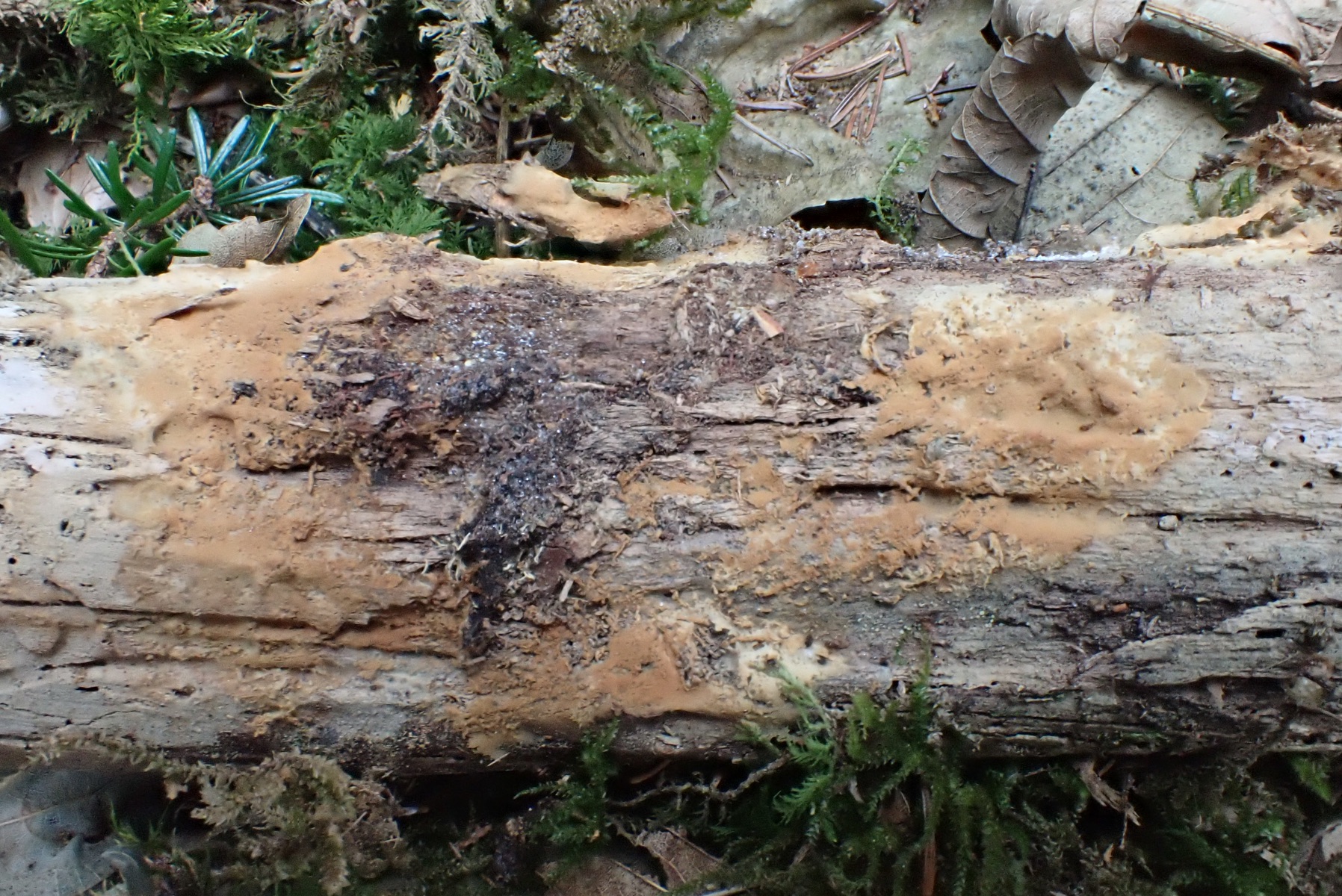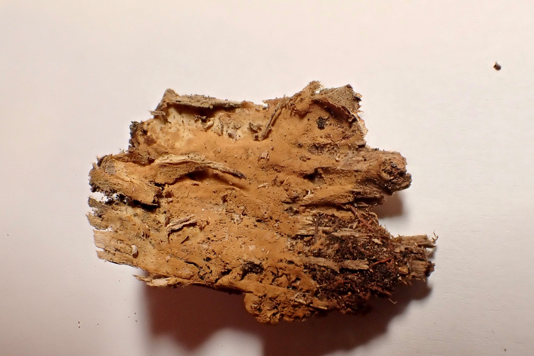 Das am Rand beige, innen braune, lockere filzige Gewebe auf der Unterseite eins finalmorschem armdicken Astes lässt sich leicht ablösen.