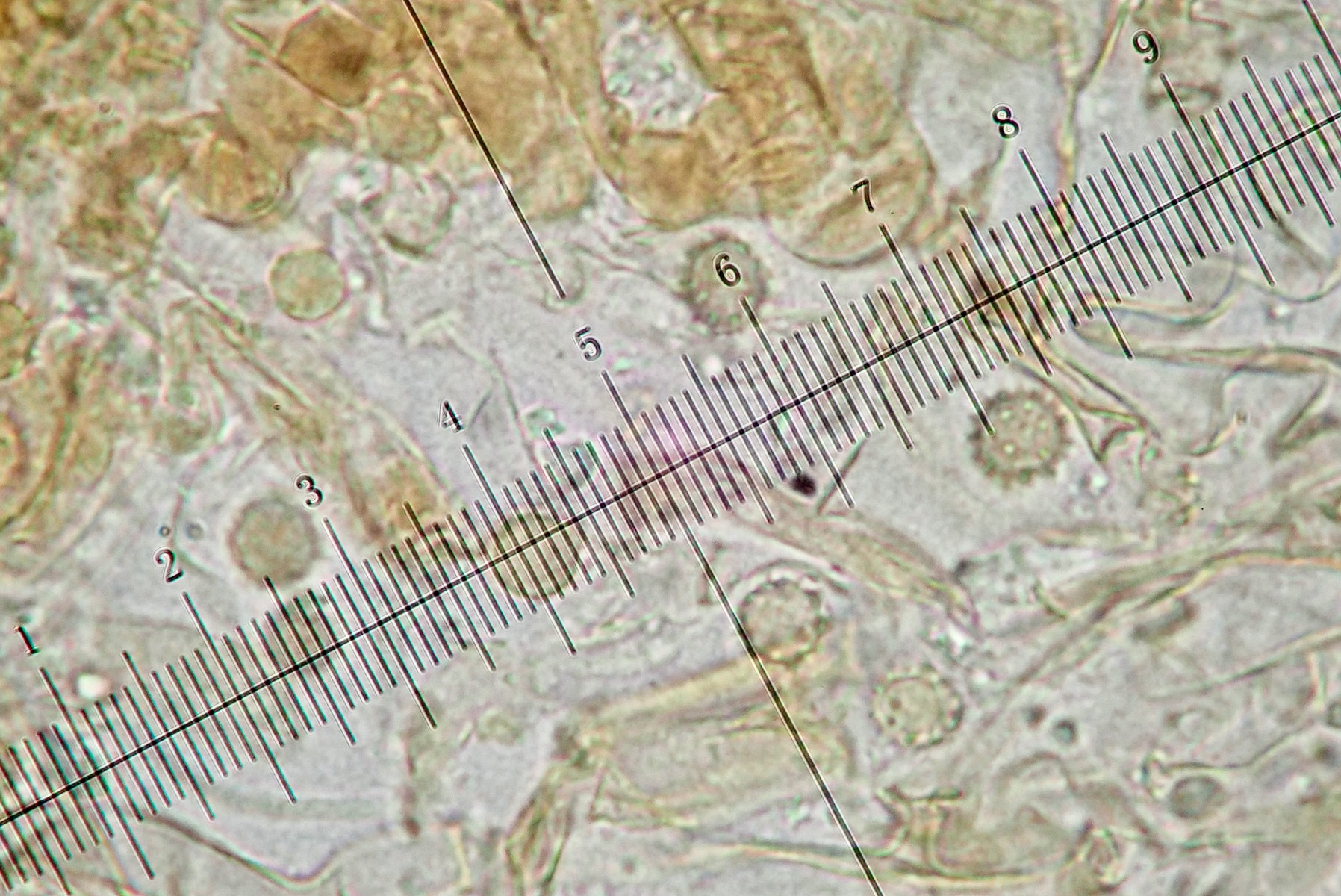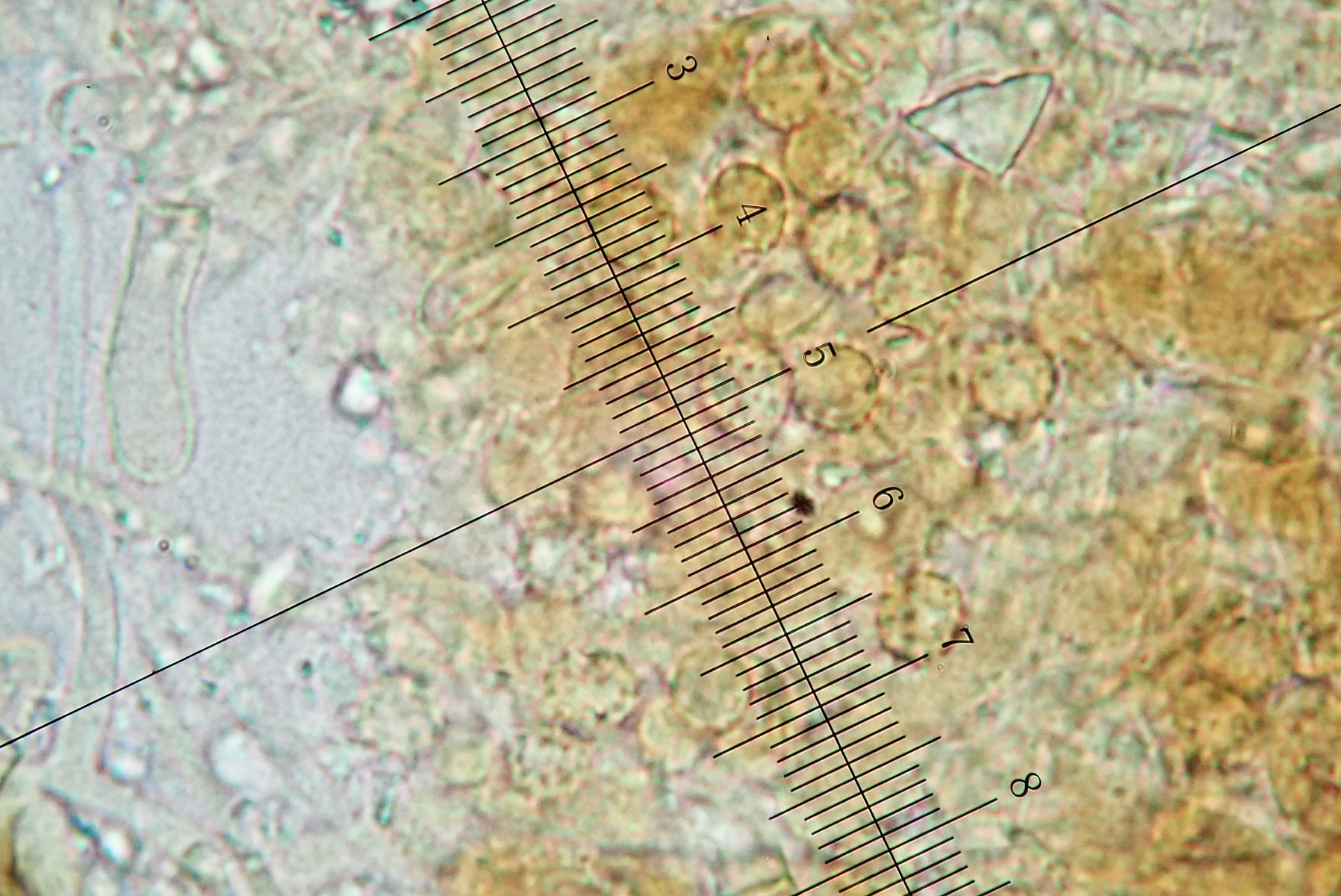 Die Sporen sind hellbräunlich, regelmäßig rund und messen im Mittel ziemlich genau 5ym. Die nicht bifurkaten Stacheln sind meist um 1ym lang.