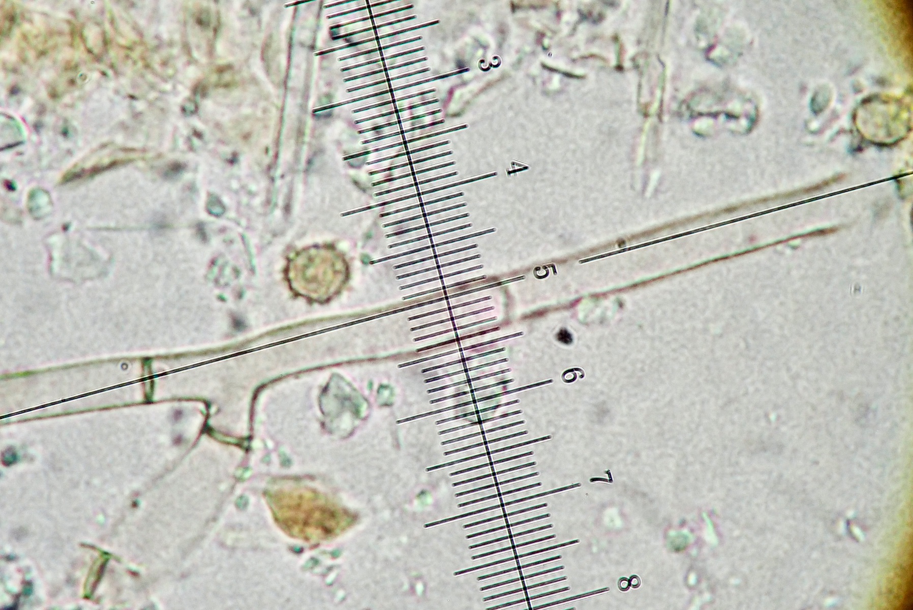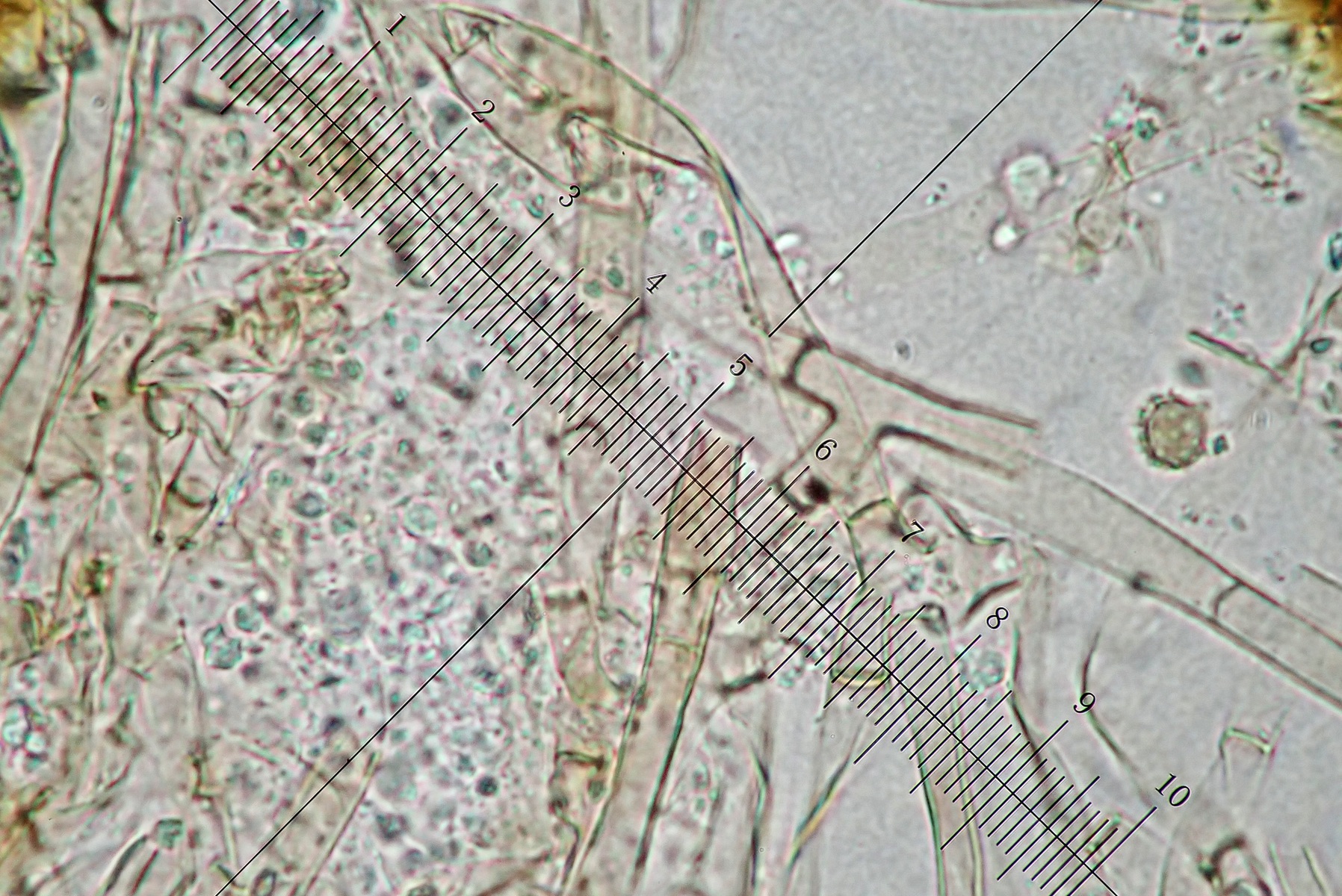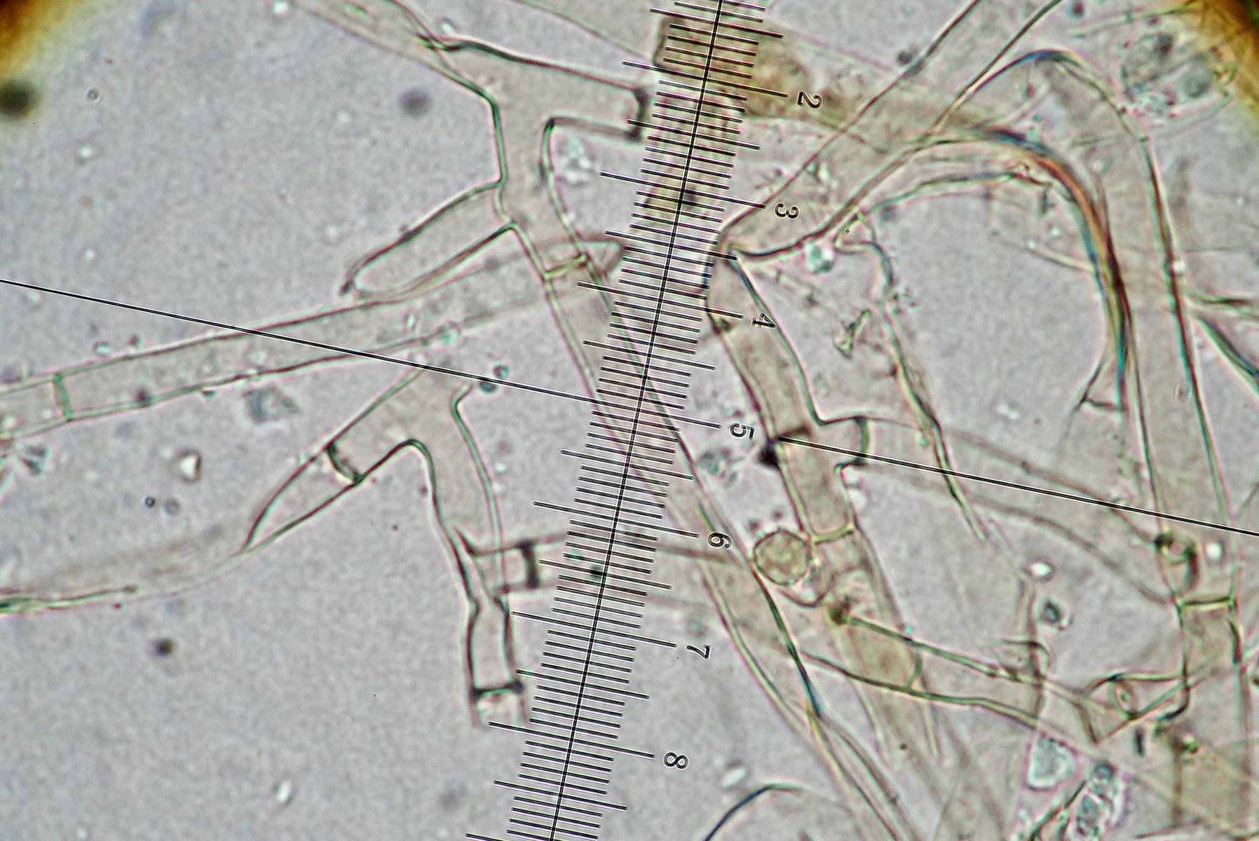 Die 4-5ym dicken farblosen teils auch hellbraunen Hyphen sind dünn- bis dickwandig.
