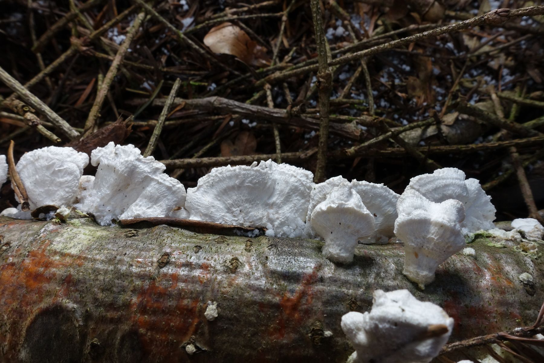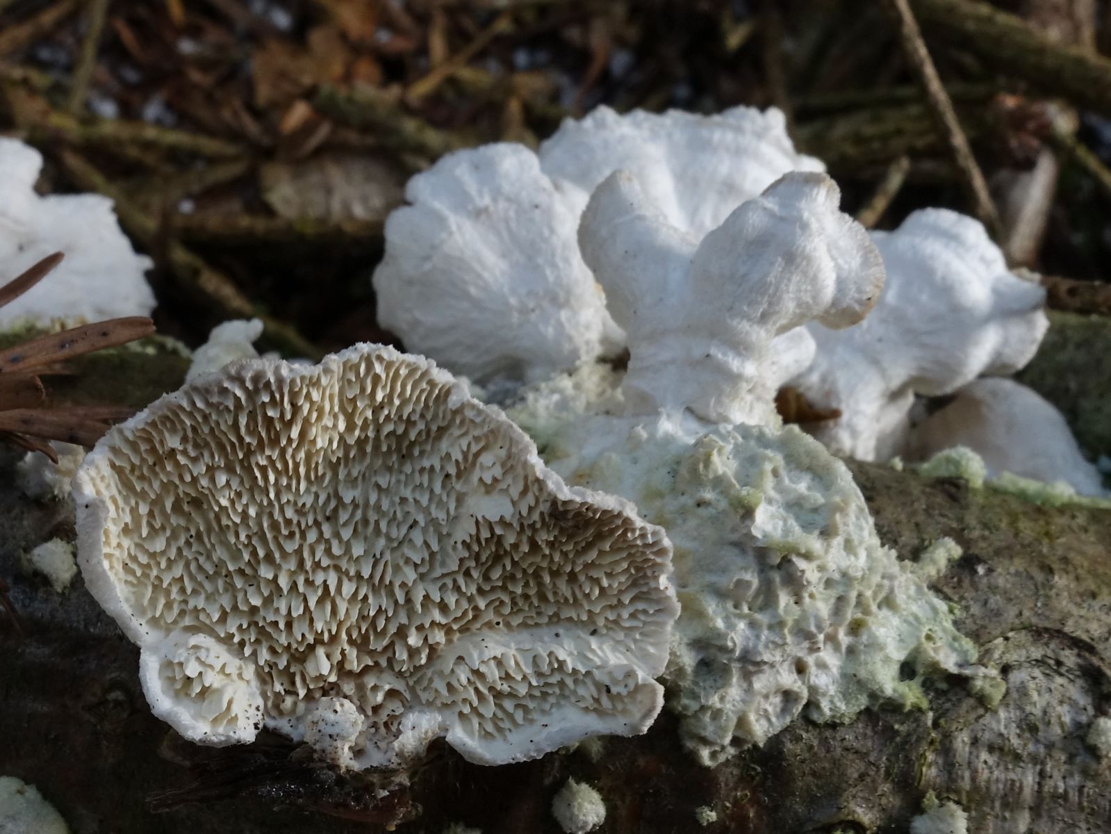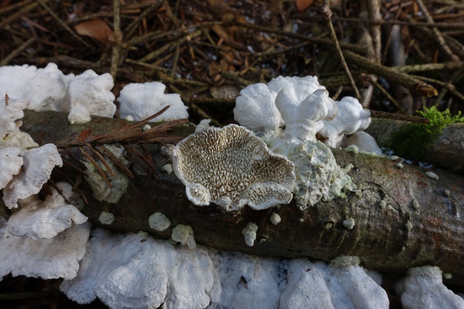 weißer Pilz auf Holz mit stacheligen Poren - Irpex cf. lacteus
