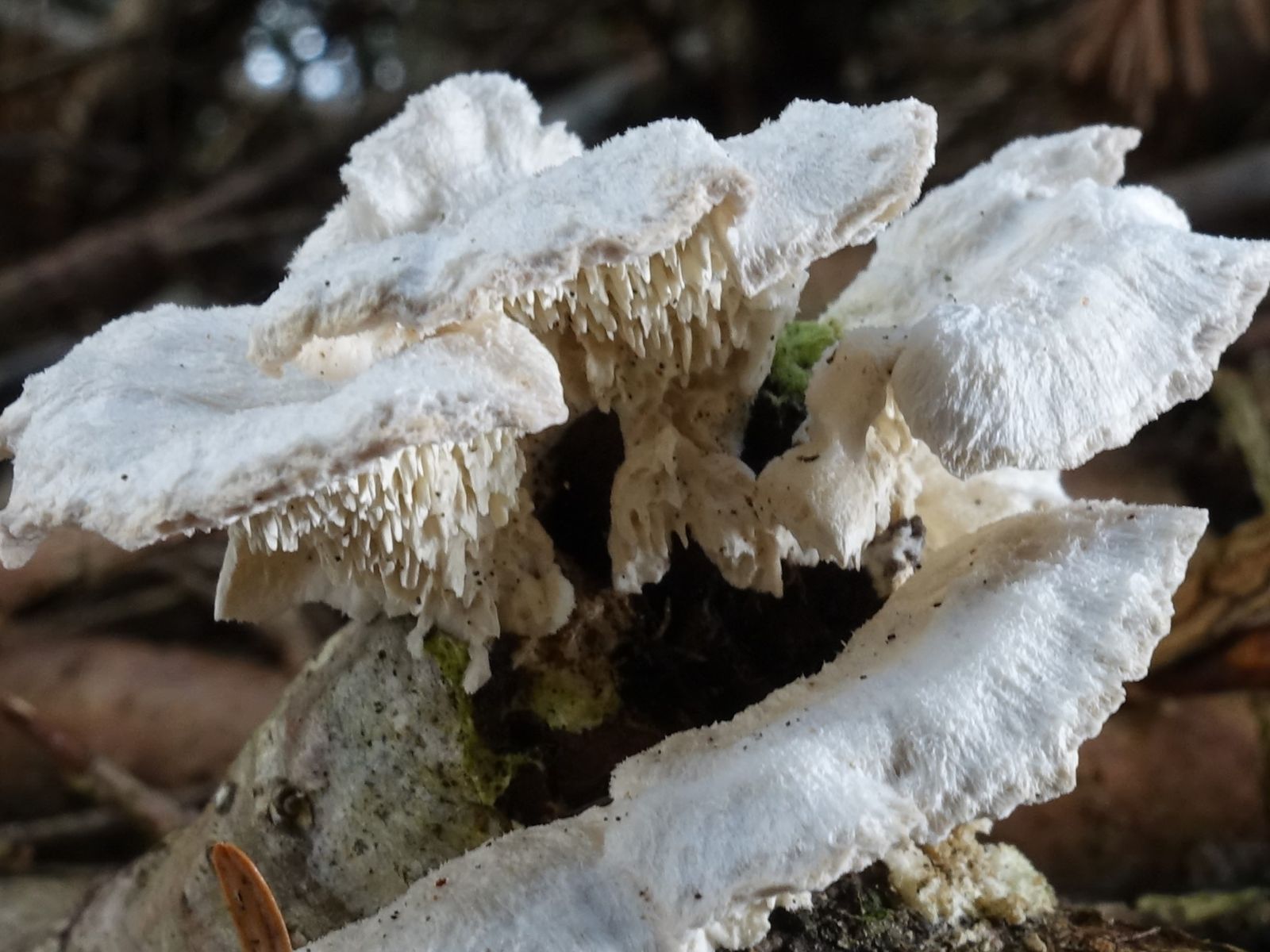 Farbe sieh Fotos - weiß, durchschnittlich 2-3 cm breit, Oberfläche leicht „behaart“, fransig, teilweise grüne Töne (Algen?), wie z.B. bei Spaltblättling. Einige FKs besitzen ein stielartiges Gebilde, das oft kleine Grübchen mit scharfen Kanten zeigt.