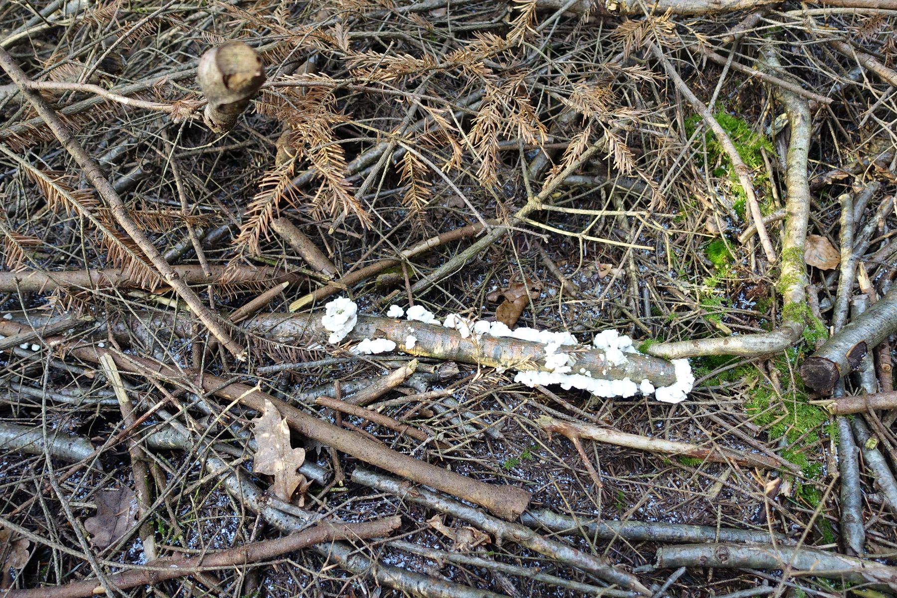 Waldabschnitt überwiegend mit Tannen, 4 m von dem Waldrand entfernt (genug Licht), Pilz auf einer Ast, vermutlich Tanne (Laubholz), die auf der Stelle gerade ein Jahr liegt (Schneebruch 2024). 500 Meter