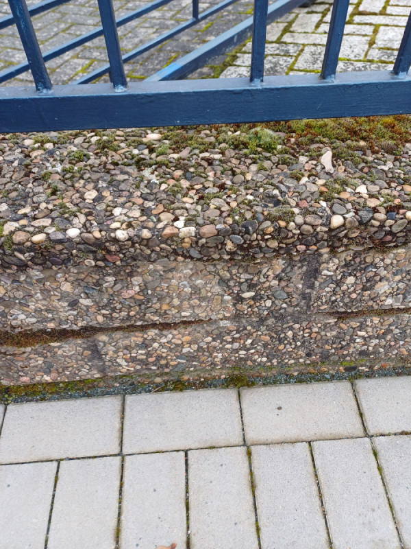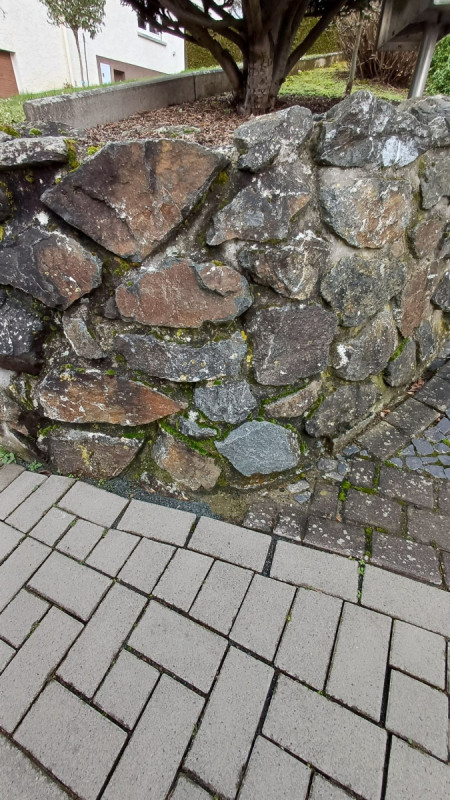 Unterer Mauerbereich mit schwachem Bewuchs.
