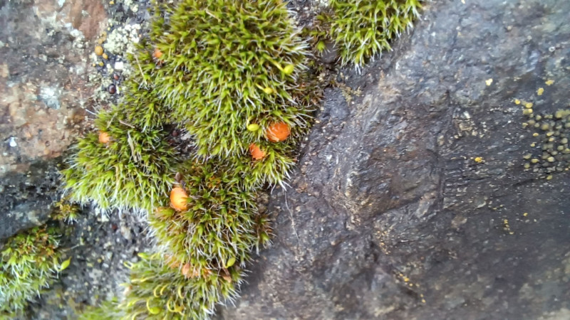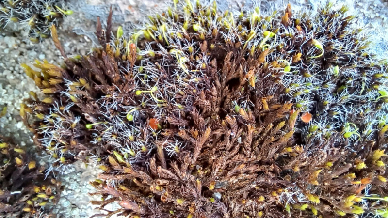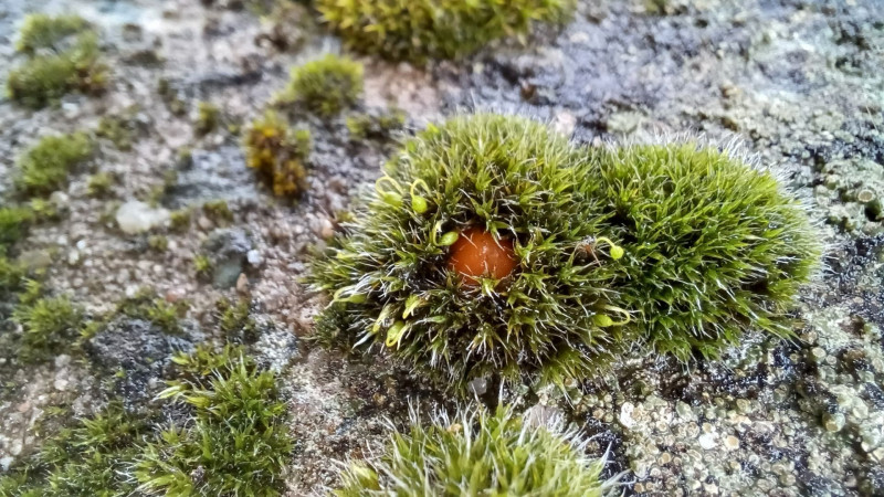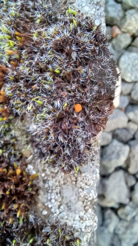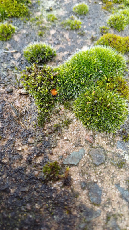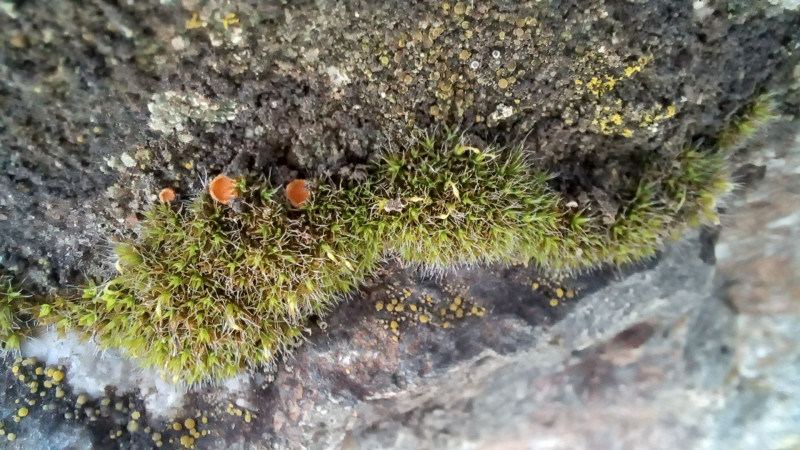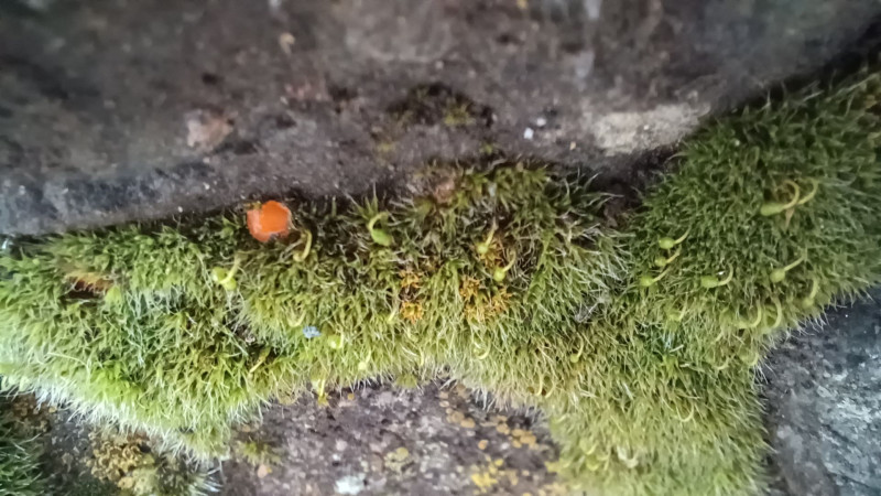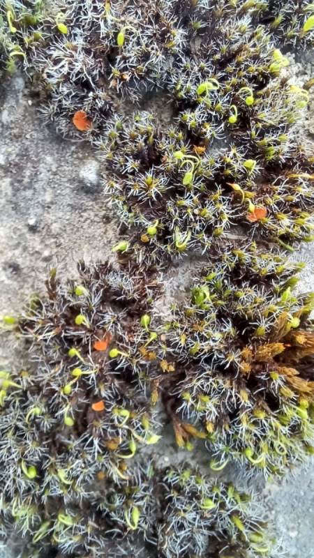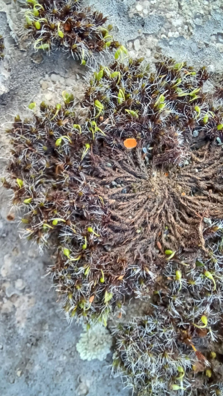 Fast jeder Randstein, jede Mauer mit dem Wirts-Moos Grimmia pulvinata, ist von Moosbecherchen besiedelt.