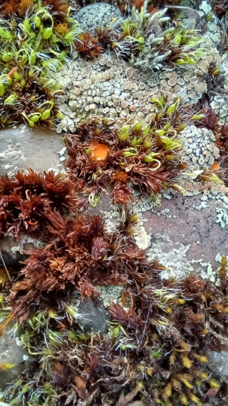 heute, am 25.1.25., habe ich drei bemooste Mauern abgerastert. Und an einer Bruchstein-Mauer wurde ich fündig. Auf der Mauerkrone und am Mauer-Bogen. Bestimmt 30 Fruchtkörper! Es gibt also hier in Solms immer noch frische Mauer-Moosbecherchen, Octospora musci-muralis