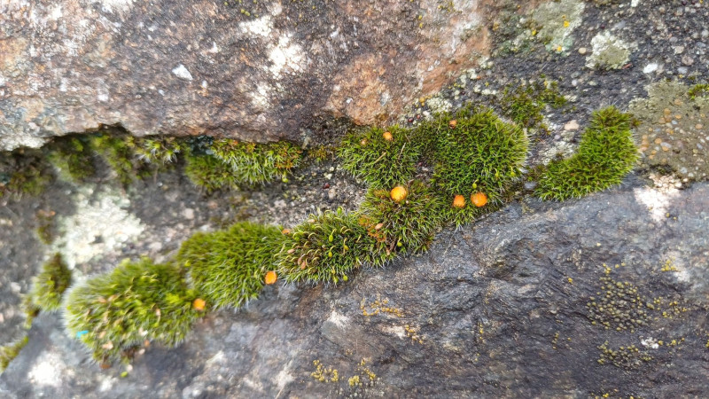 Auf dieser Mauer befanden sich die infizierten Mooskissen in einem besseren Zustand. Dennoch war die Schwächung durch den Becherchen-Befall oft zu erkennen.