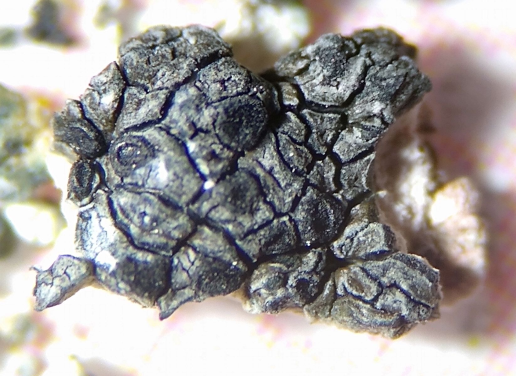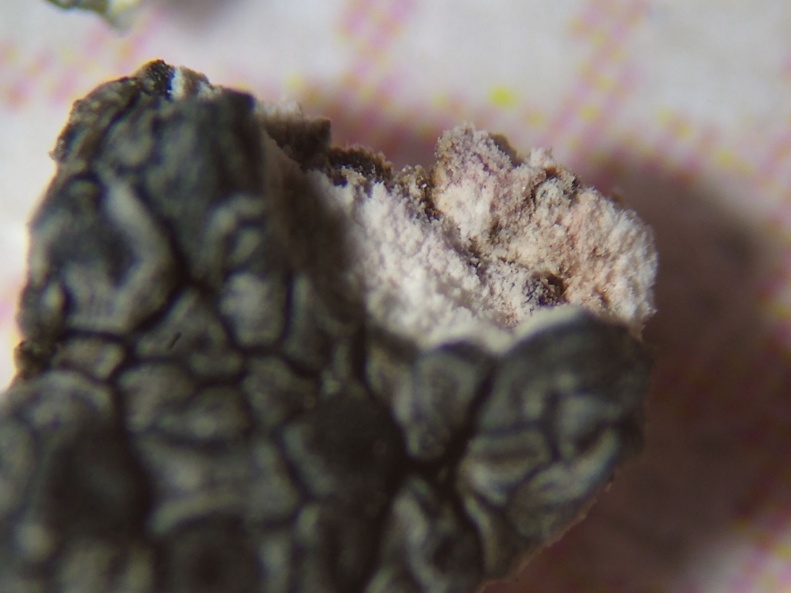 Bild 6 Der Thallus wirkt stellenweise schwarz. Das Teilstück oben, in seitlicher Ansicht, zeigt eine Thallusdicke um 1 mm. Die Die Oberfläche der Areolen sind konvex gewölbt.
