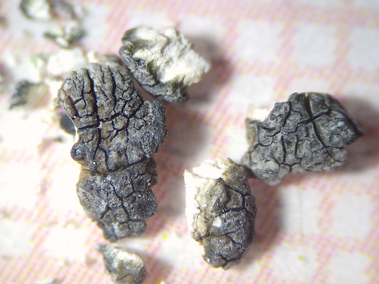 Der linke Krümel besitzt 2 unscheinbare Apothecien. Das nach oben zeigende Ende entspricht vermutlich dem Thallusrand mit etwas verlängerten Randareolen. Sie sind radial verlängert.