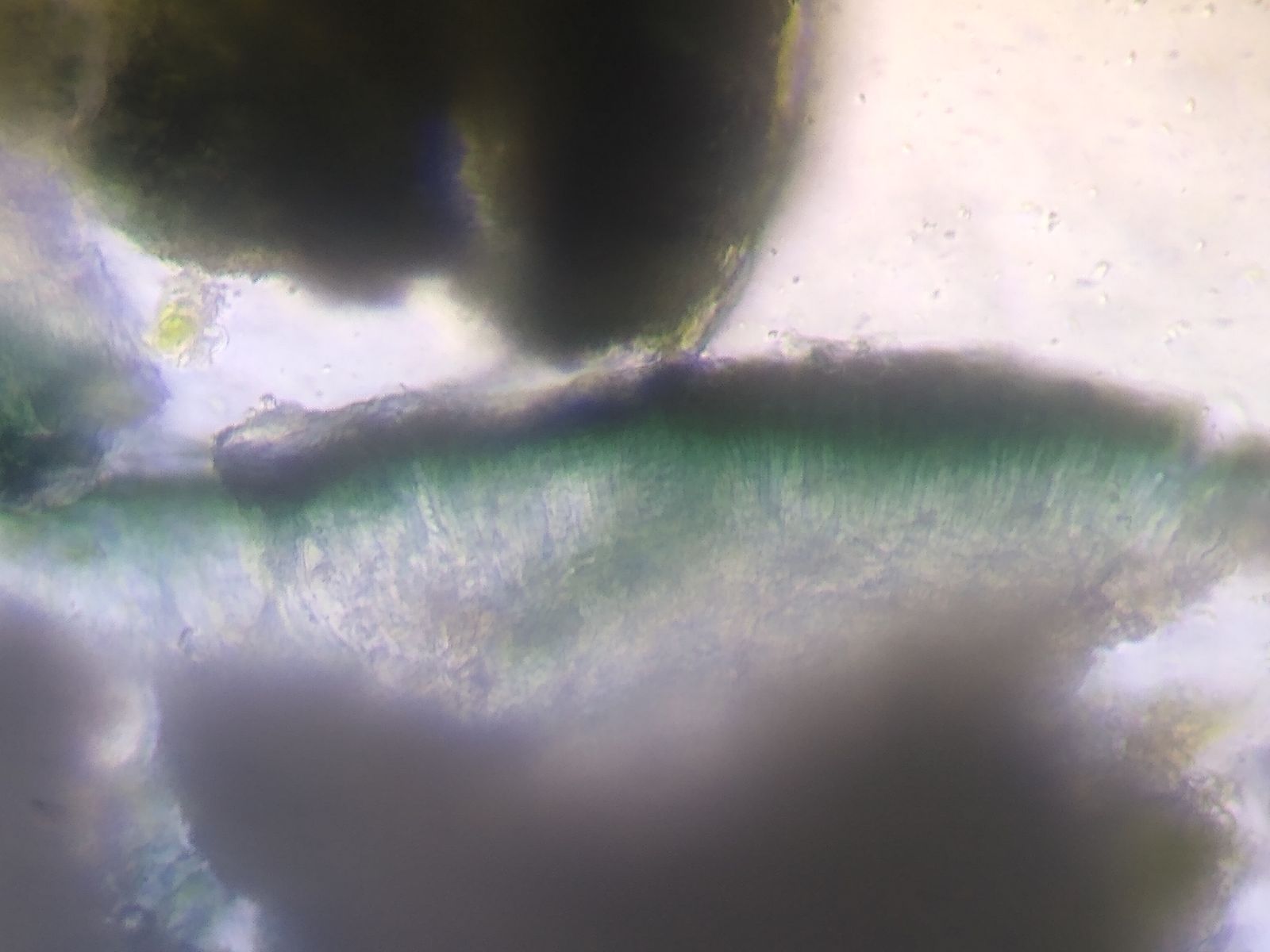 Bild 9 Beim Quetschen in Wasser erkennt man, dass die Paraphysen stark verklebte sind. Sie quellen und lockern sich nach KOH-Zugabe. Das Epihymenium und der obere Teil des Hymeniums ist smaragdgrün. Darunter ist das Hymenium farblos. Auch das Hypothecium ist farblos. Der opake Bereich darunter wird von Medulla abgedunkelt. Das Wasser neben der Probe wird von vielen kleine Kristallen der Thallusbereifung getrübt.