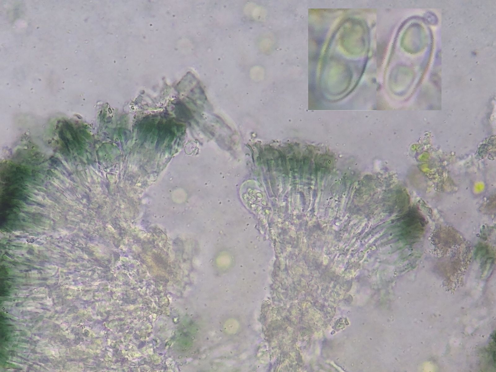 Bild 10 Nach KOH-Zugabe lässt sich das Hymenium besser quetschen. Asci sind nur wenige zu entdecken, freie Sporen noch weniger. Asci mit deutlich erkennbaren Sporen sind Mangelware. Die wenigen gefunden Sporen sind dickwandig und messen 11-12 x 5,0-5,5 µm. Sie sind einzellig, elliptisch, hyalin.
