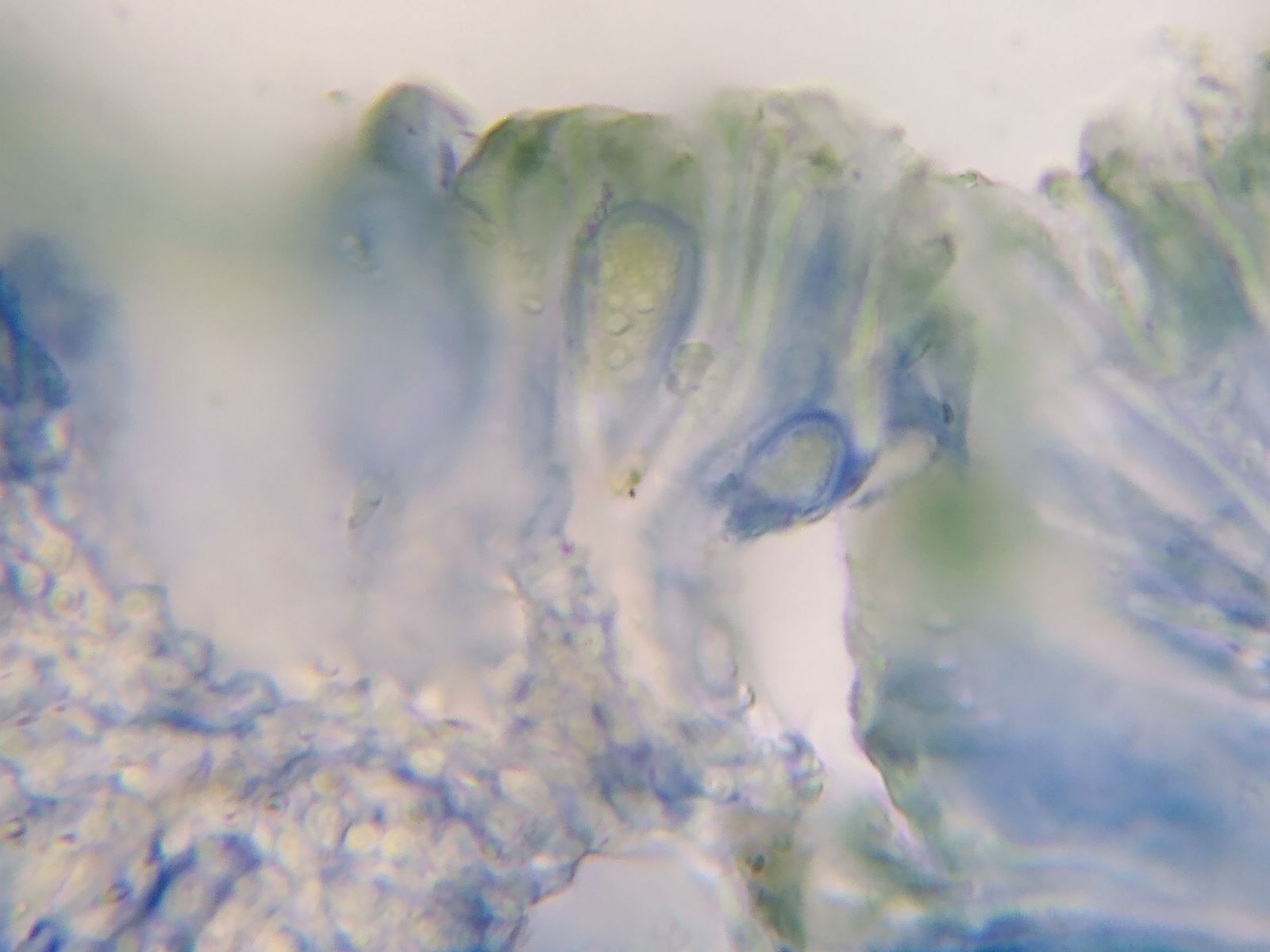 Auffällig ist die blaue Reaktion unter dem Hymenium im kugelzelligen (?) Hypothecium.