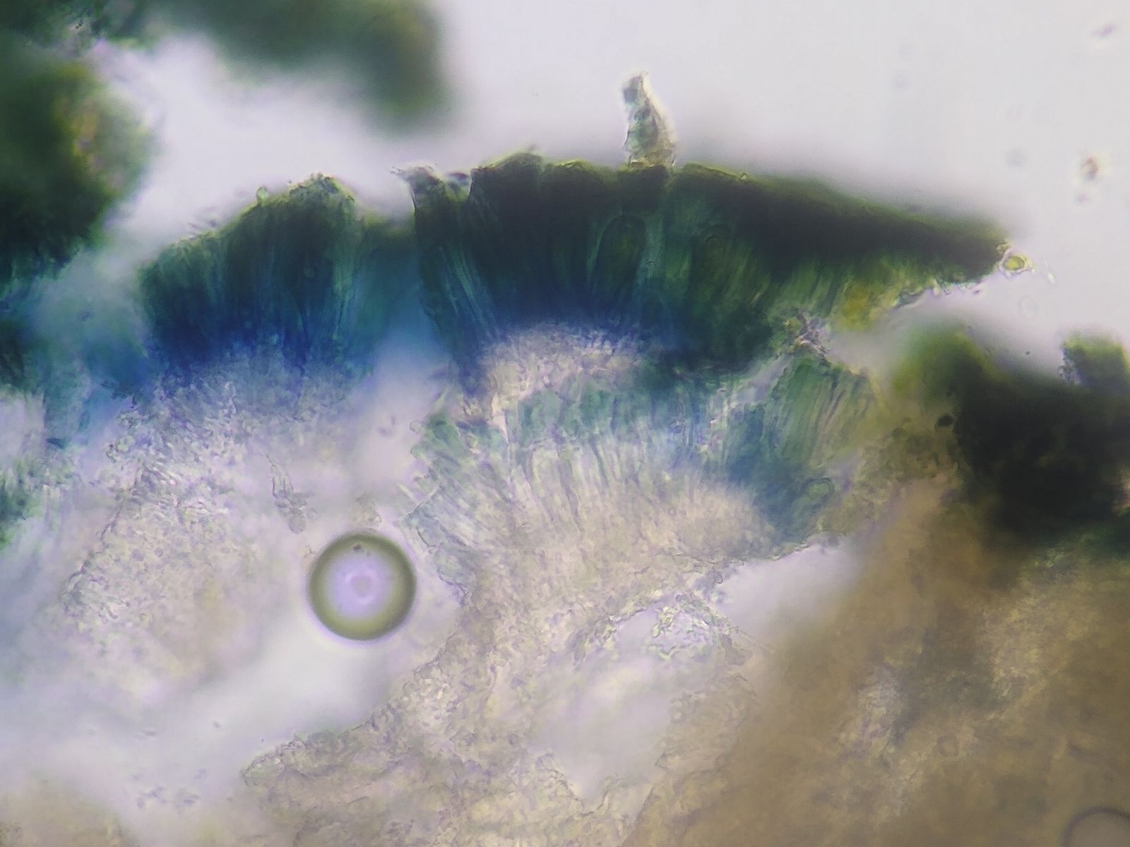 Bild 14 Hymenium nach Lugolzugabe: Tiefes Hymenium und Hypothecium reagieren tiefblau. Die Schichten weiter außen sind grün, teils sogar gelb...