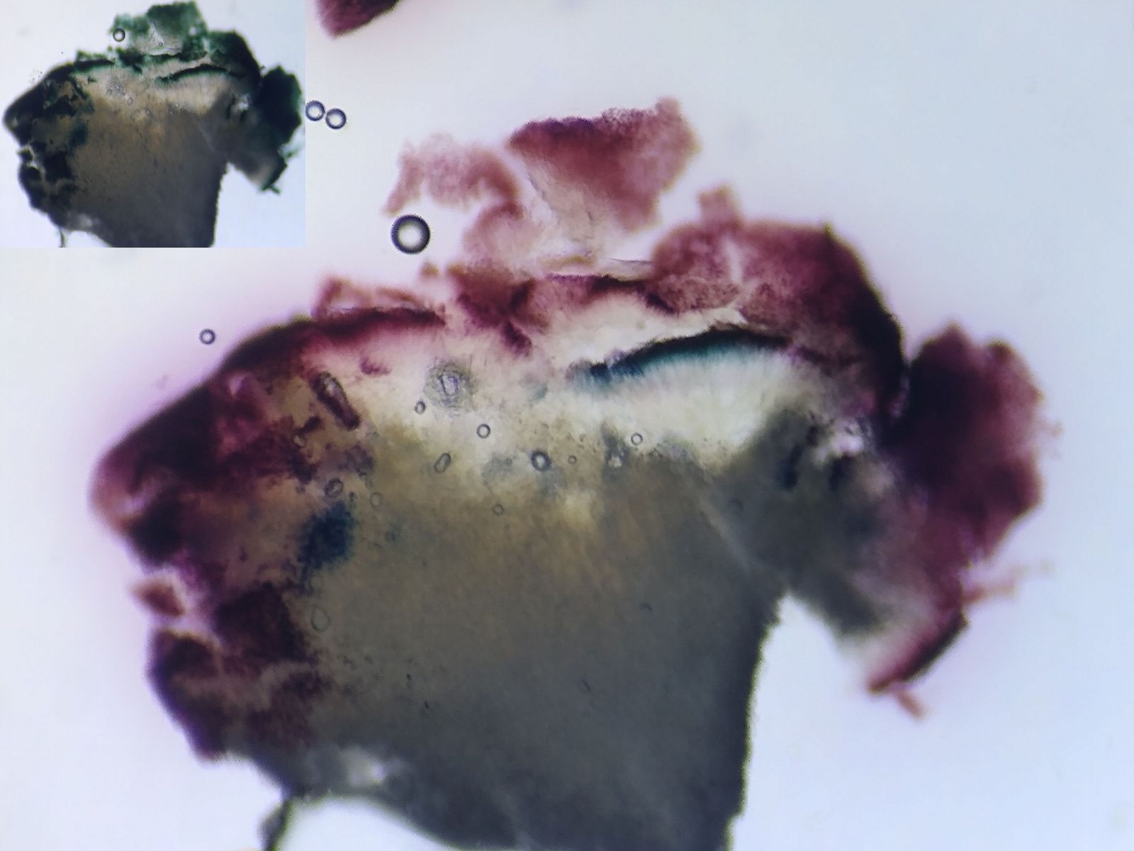 Bild 17 Kontrolle eines Probenkrümels in HNO3: der Cortex reagiert ebenfalls N+ violett.