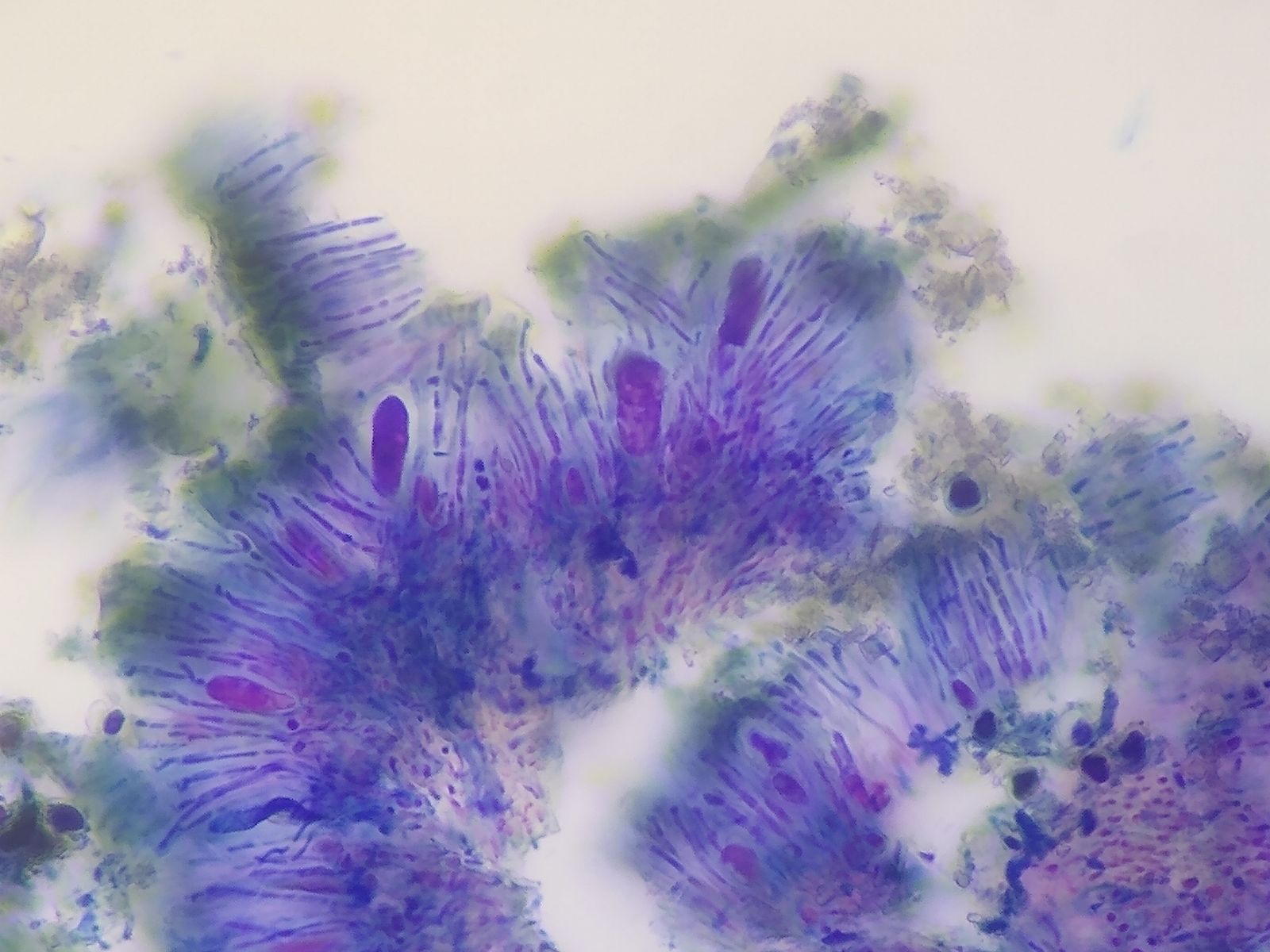 Bild 18 Hymenium eingefärbt mit LAS: Paraphysen einfach, ev. gelegentlich leicht verzweigt (links im Bild).