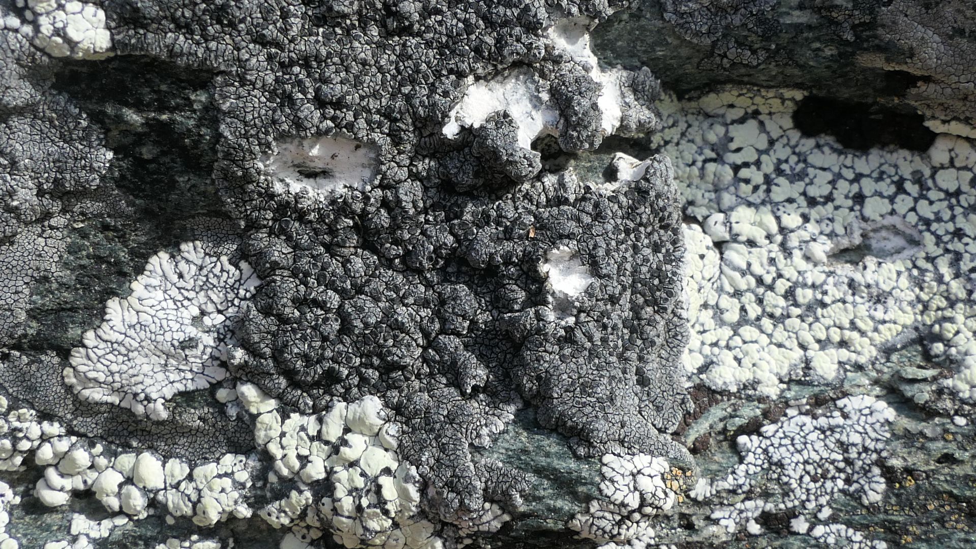 Bild 4 Die Flechte überwächst andere helle Krustenflechten. Der Thallus ist dick. Zahlreiche kleine, schwarze Apothecien sind zu erkennen. Hier wird eine kleine Probe abgekratzt und zur Analyse mitgenommen.