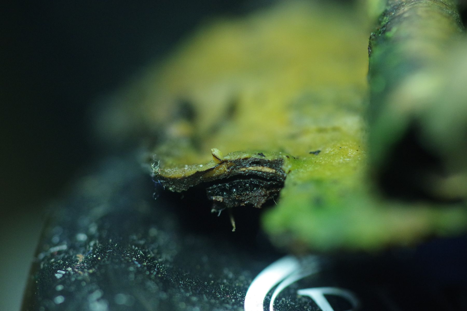 Wenn ich Franks Schlüssel folge, komme ich wegen fehlender Schwarzfärbung zu Tomentellopsis, wo aber höchstens Tomentellopsis pallido-aurantiaca in Frage käme [dazu finde ich aber nichts], da die anderen Arten dann mit deutliche kleineren Sporen geschlüsselt werden.