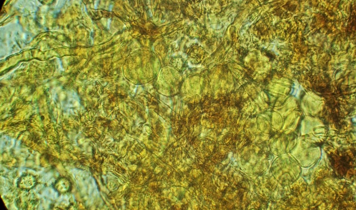 oberseits dünnere hyaline Hyphen 3-4 µm, meist ~120° Verzweigungen, teils septiert, ohne Schnallen, in dickerer Schicht blassgelb; Sporen überwiegend rund, vereinzelt bis Q ~1,2, 8-10 µm groß, Stacheln ~1 µm, unterseits auch breitere Hyphen ~5 µm, bräunlich (diese Bilder in Melzers) und mit Schnallen. Dann gibt es noch kugelförmige Elemente um die 20 µm groß.