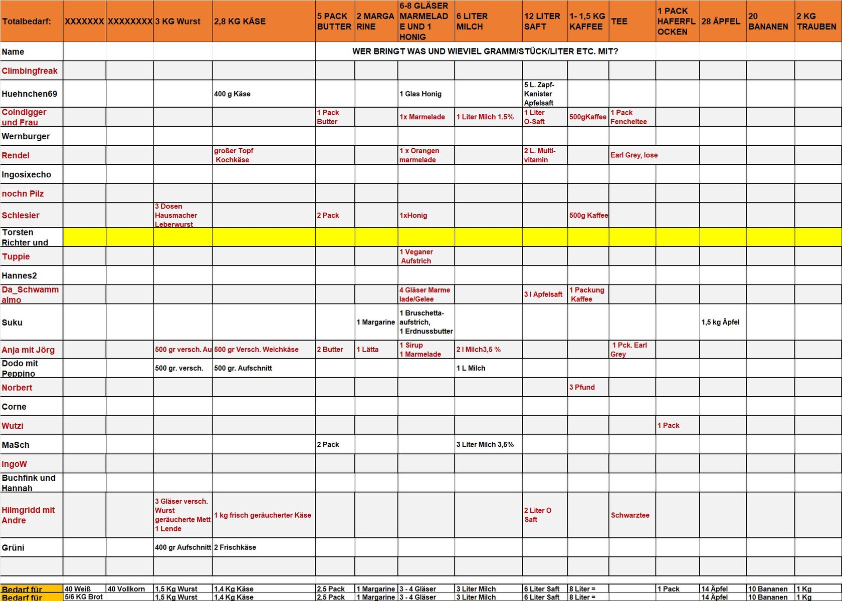 Wie Ihr sehen könnt, sind die hinteren Spalten beim Obst ziemlich leer. Da Durnik nicht kommen kann und deswegen die 20 Bananen ausfallen, gibt es keine - es sei denn, jemand anderes bringt welche mit. Wenn noch jemand etwas mitbringen will, macht das. Eintragen tu ich jetzt nichts mehr - falls etwas Zuviel ist, nimmt man es einfach wieder mit nach Hause, wenn etwas fehlt....gibt's das halt nicht ![]()