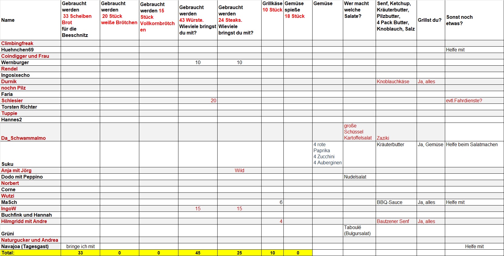 Hier noch das was Ihr für den Grillabend mitbringen wollt: