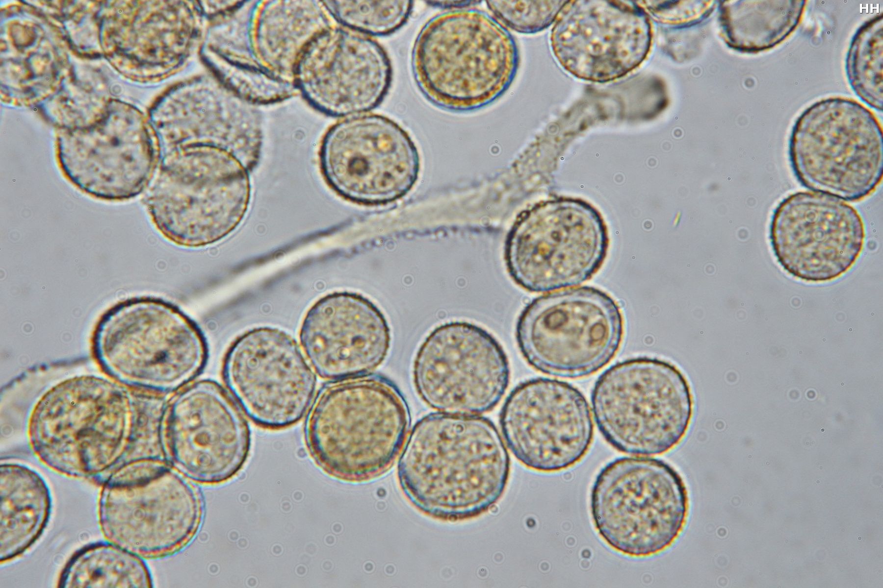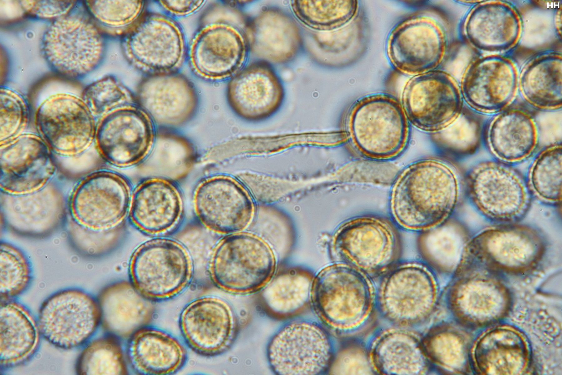 Die "inneren Werte" zeigen in Durchsicht ockerfarbene, rundliche Sporen mit deutlichen Warzen und Strukturen, die ich als Bruchstücke des Capilitiums deute: