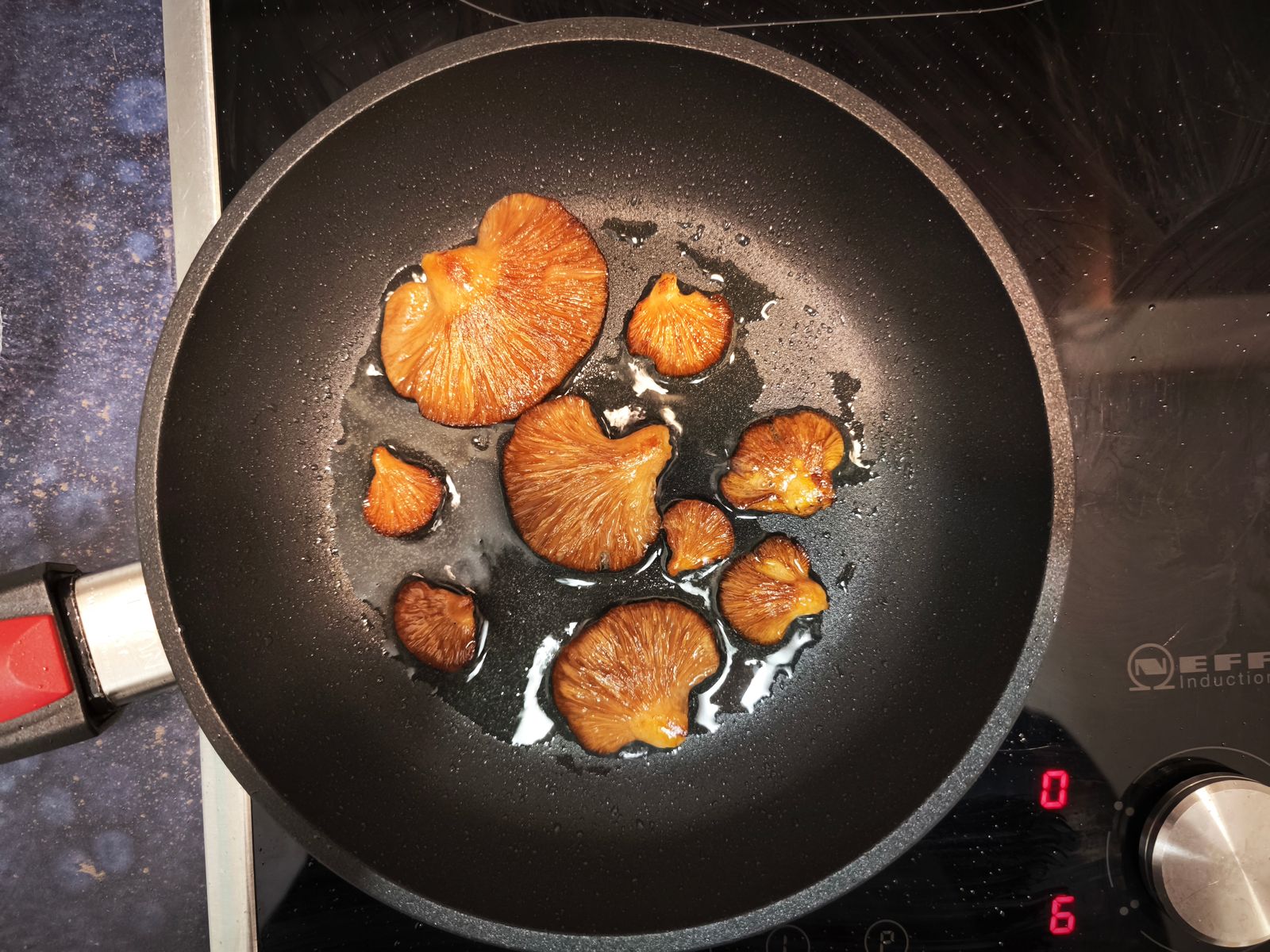Ich habe die Pilzhüte abgebürstet und eine Pfanne mit etwas Sesamöl angesetzt. Die Pilzhüte wurden zunächst mit den Lamellen nach unten gebraten und dabei mit einem Topf angedrückt. Ziel: Guter Pfannenkontakt und schnelleres Austreiben des recht hohen Wassergehalts der Art. Nach 7 Minuten braten von einer Seite wurden die Pilze gewendet und nochmals (wieder angedrückt) auf der Hutseite 7 Minuten gebraten. Das Ergebnis ist dann eine schöne goldbraune Farbe.