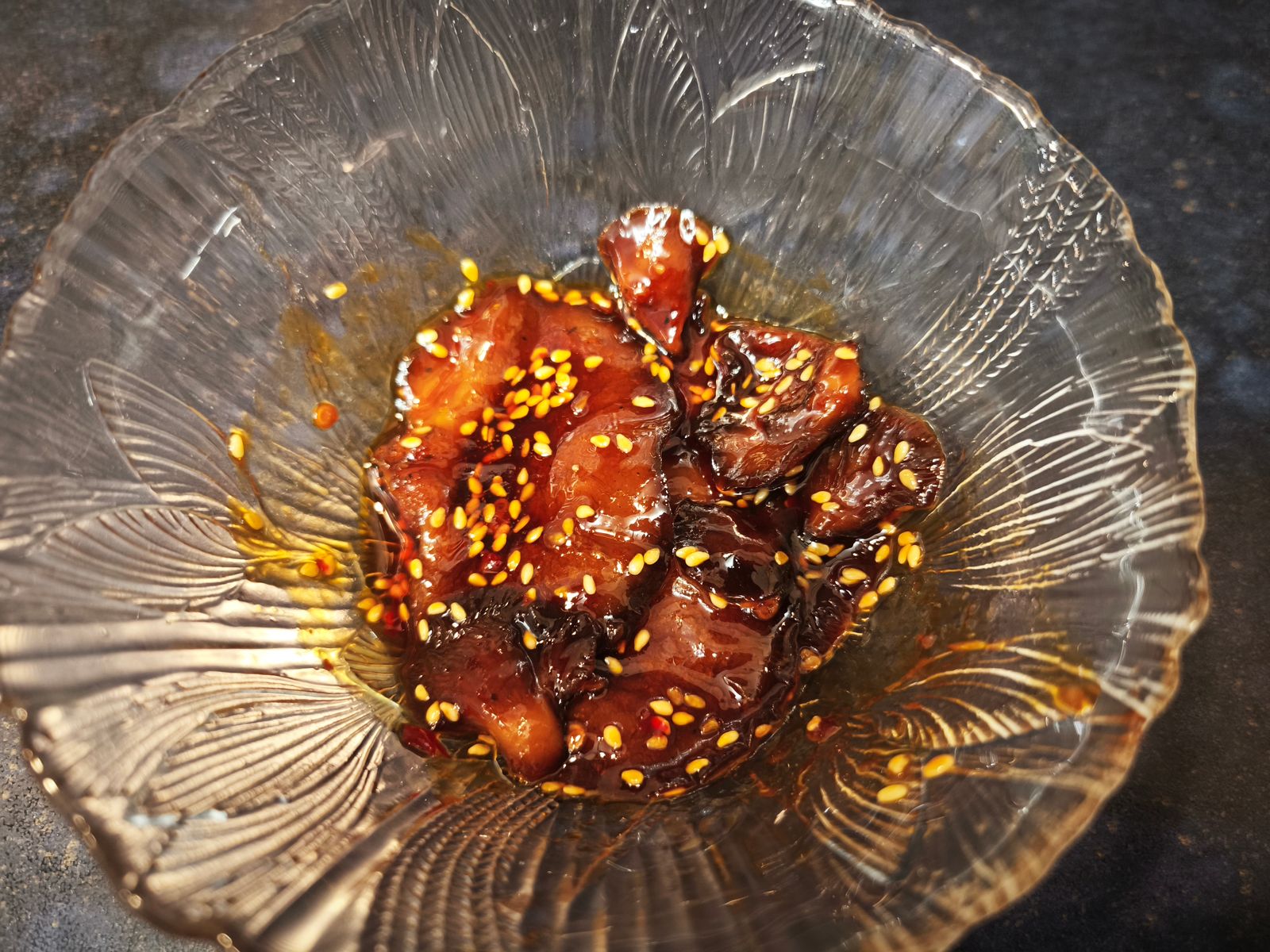In die asiatische Richtung aber tatsächlich geschmacklich ganz spannend, sofern man sich an einem herben Geschmacksprofil nicht stört. Wichtig sind dabei ausreichend Röstaromen und langes Braten, um das Wasser zu entfernen, sowie eine Würzung mit deutlich süßer Komponente als Gegenspieler zur herben Note.