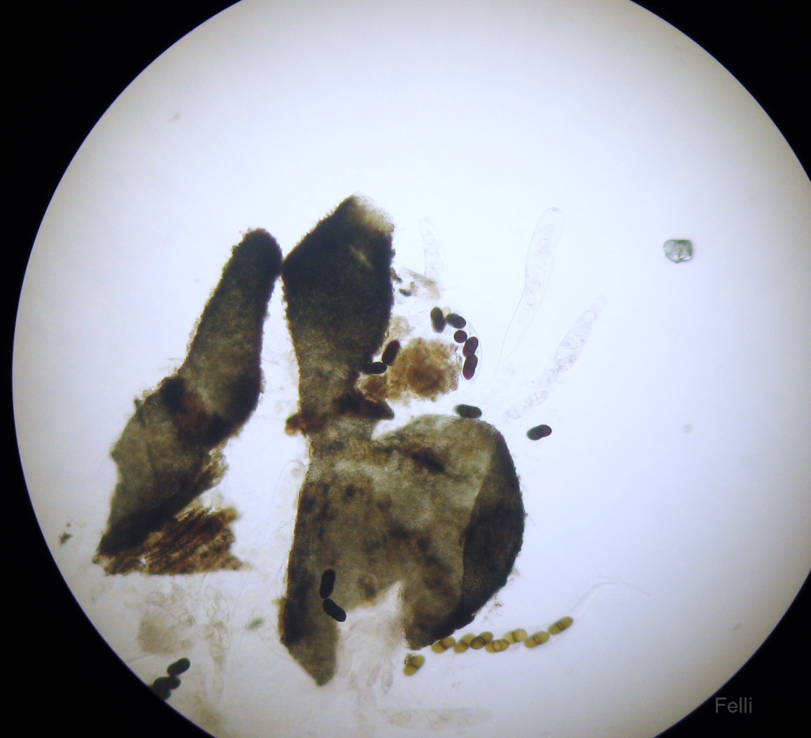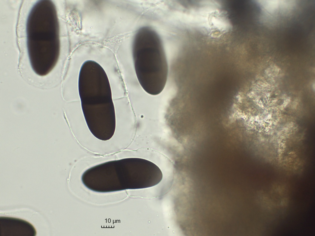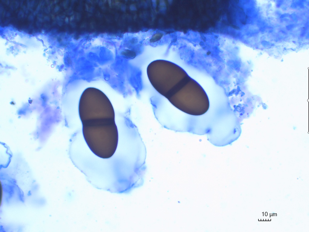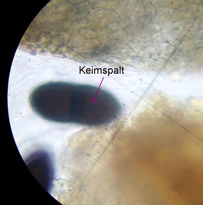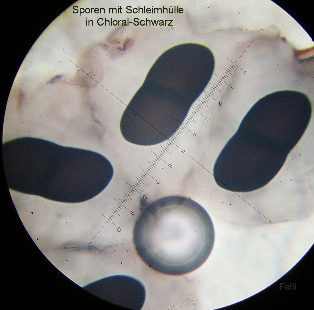 Sporen ungleichmäßig zylindrisch-ellipsoid, braun - dunkelbraun, mit dicker Schleimhülle,