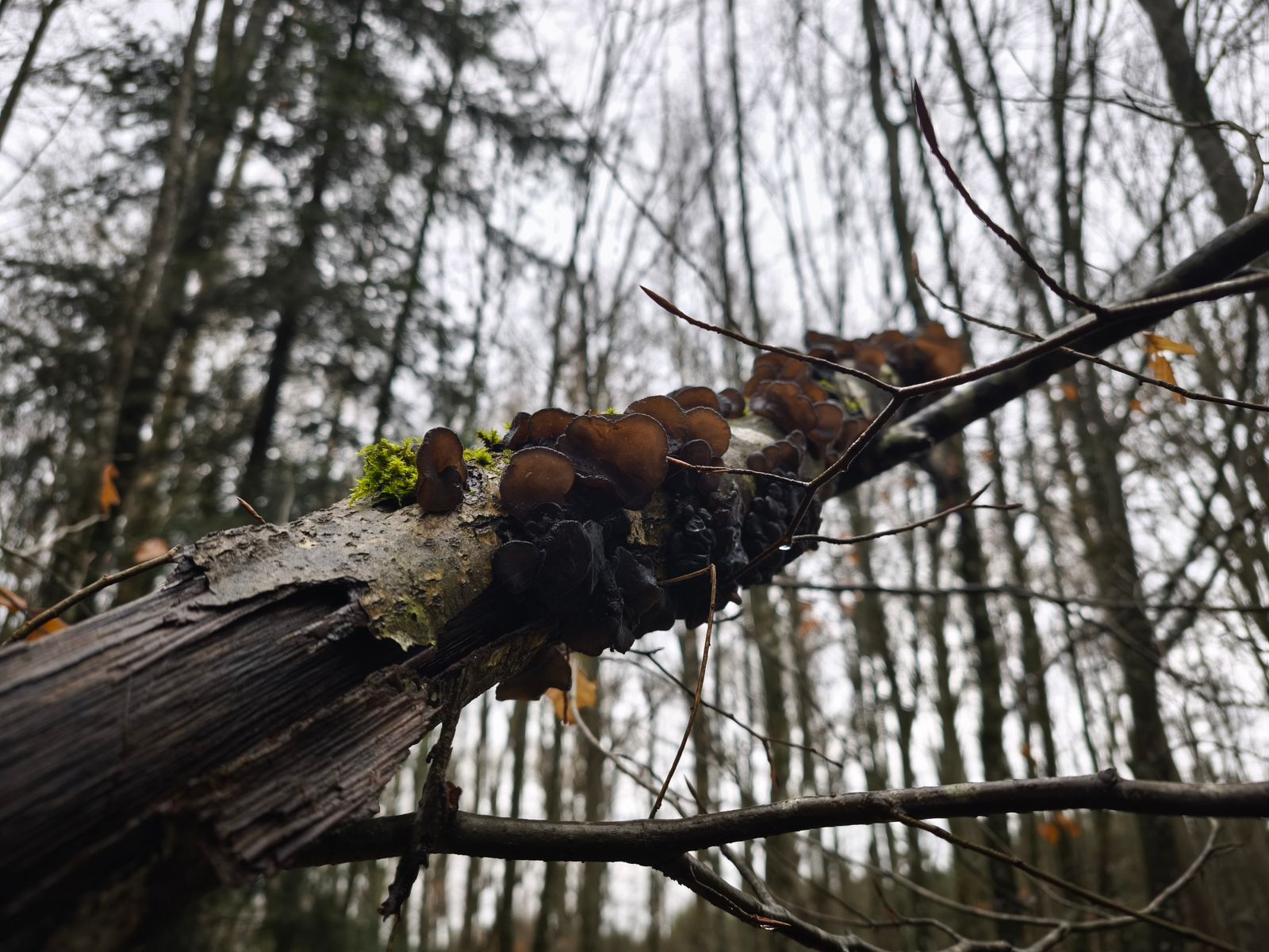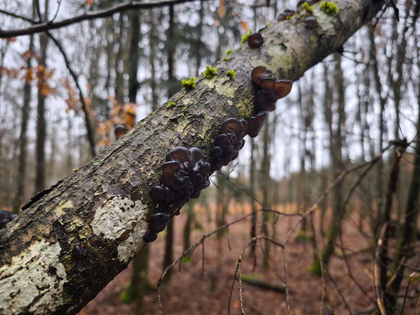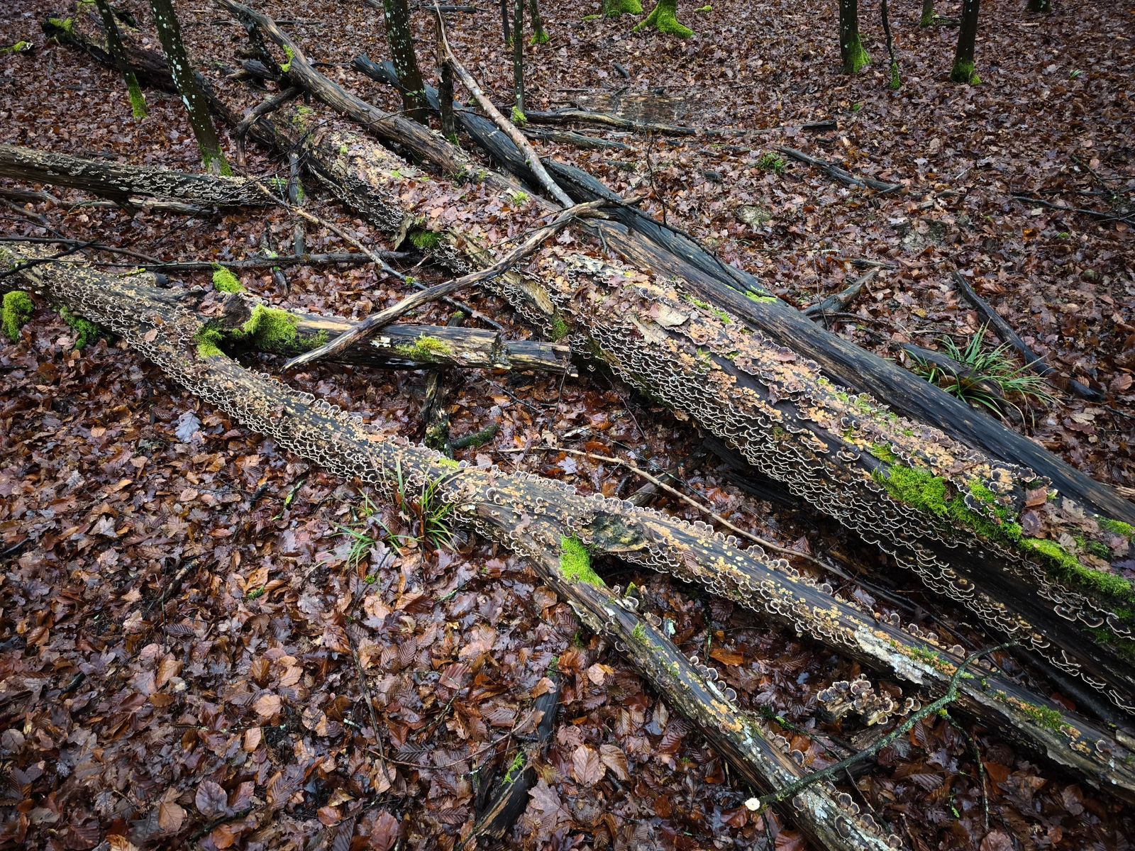 Zuerst ging es in ein Areal mit vielen Eichen, Buchen und einigen Birken wo auch einiges an Totholz herumliegt. Dort hat mich ein wahres Feuerwerk an Abgestutzten Drüslingen erwartet. Unfassbare Mengen haben dort einige Stämme geziert und zuweilen waren auch richtige Monster-Exemplare dabei.
