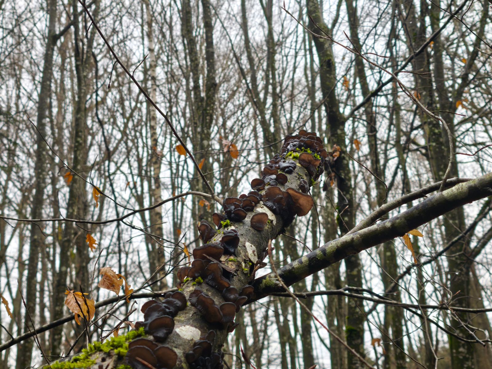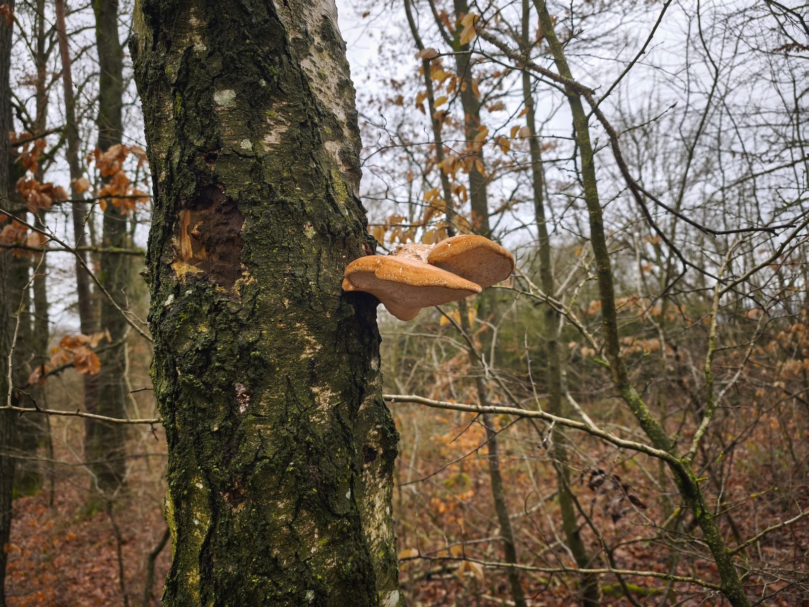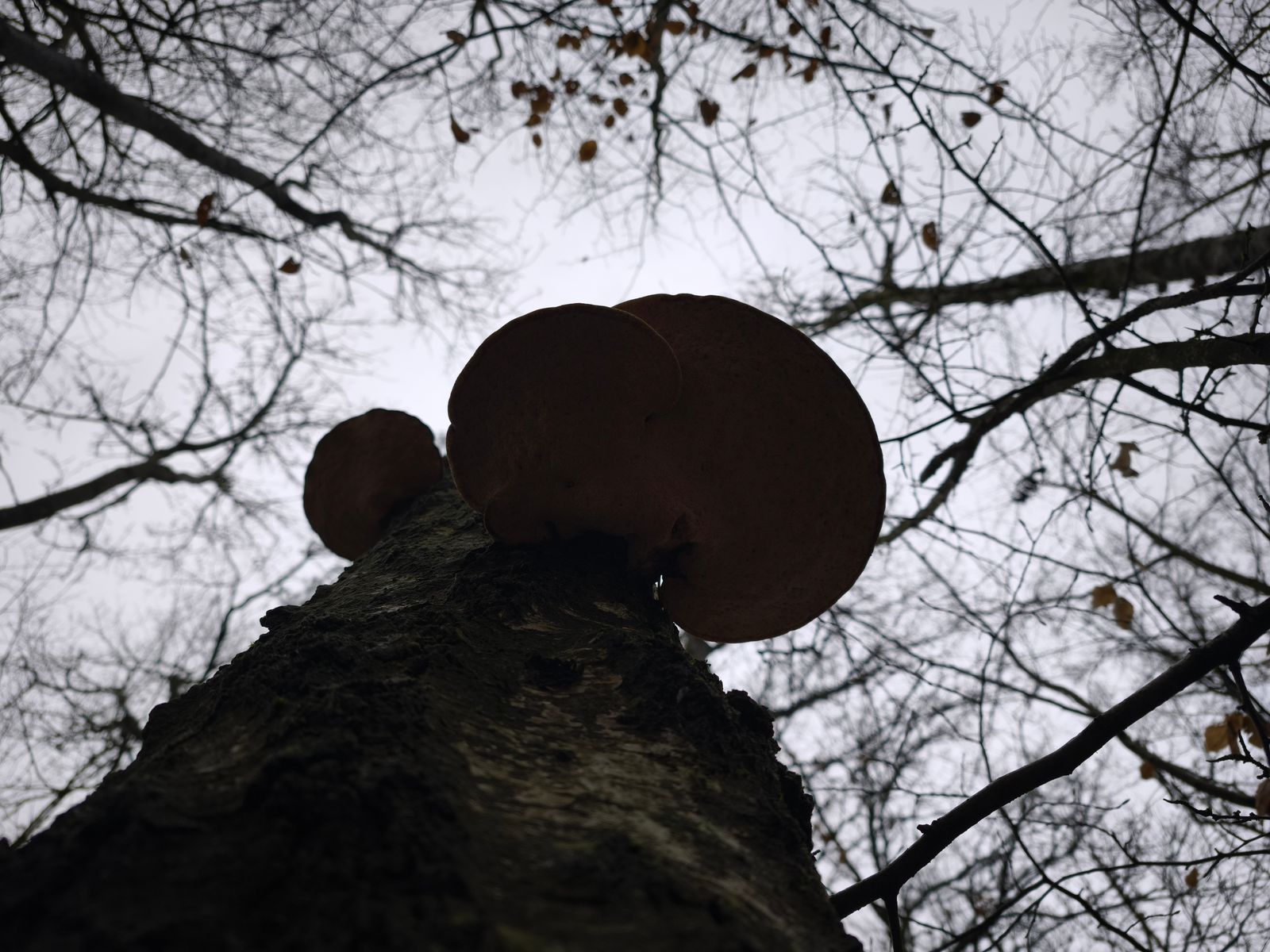 An den Birken hat sich zuweilen allerdings auch Interessantes finden lassen. Zum einen ein richtig großer Birkenporling mit interessanter Wuchsform. Nichts mehr für die Hausapotheke, aber ein willkommenes Fotomotiv. In der Größe finde ich sie nicht alle Tage.