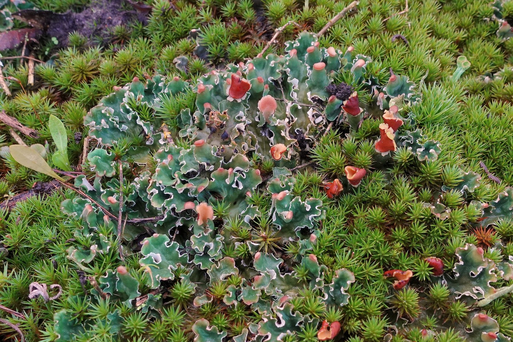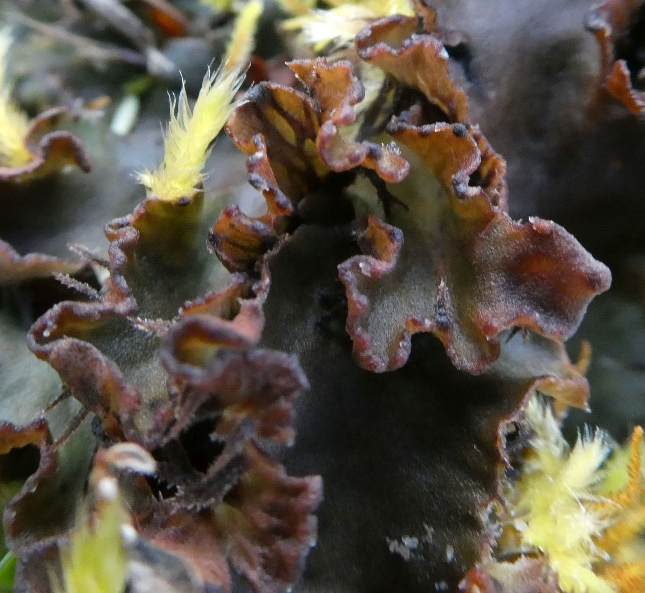 Findet ein großes Lager, so befinden sich an den jungen, randlichen Lappen diese Apothecien-Initiale, an den älteren Lappen weiter innen hingegen ausgewachsene, reife Apothecien.