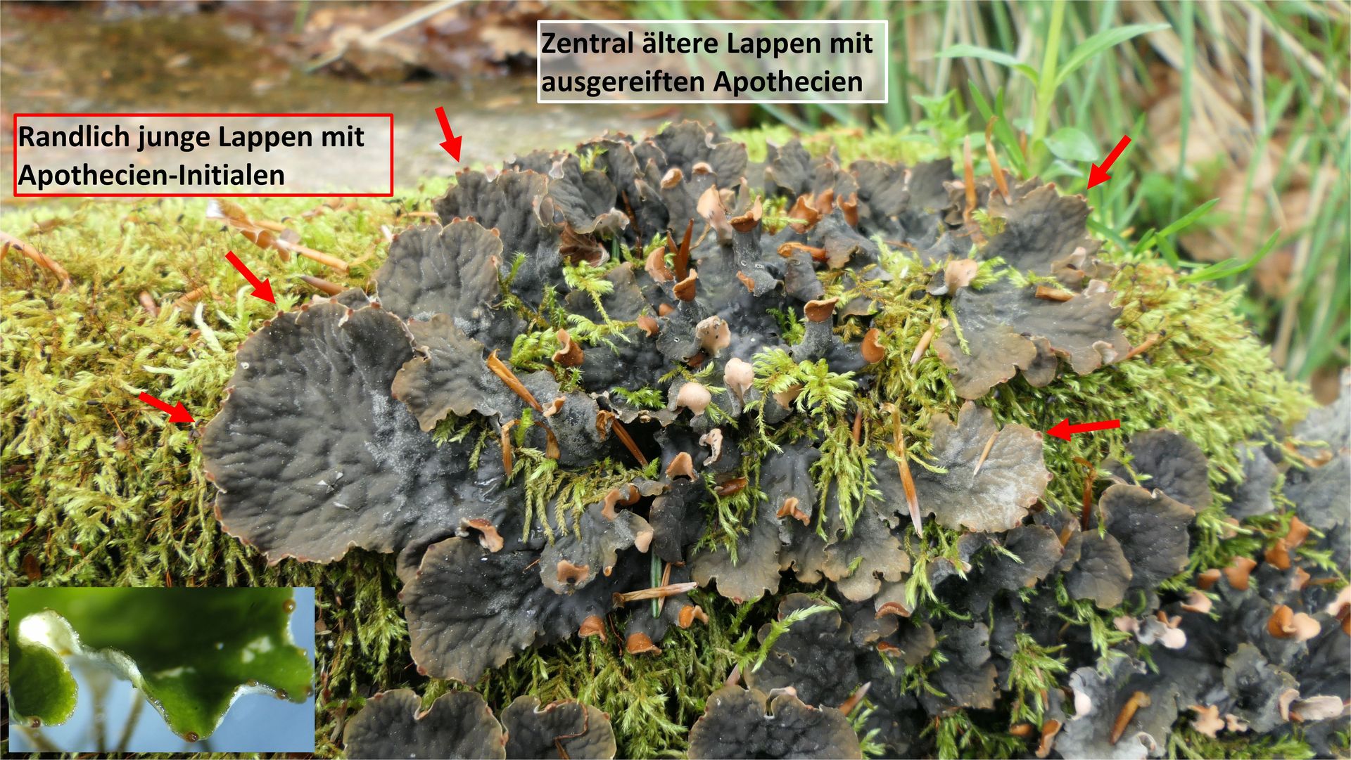 An manchen Lappen lassen sich Initialstadien (?) finden, die fast mikroskopisch klein und dunkel sind (Bildeinsatz unten links, hier Thallus feucht).