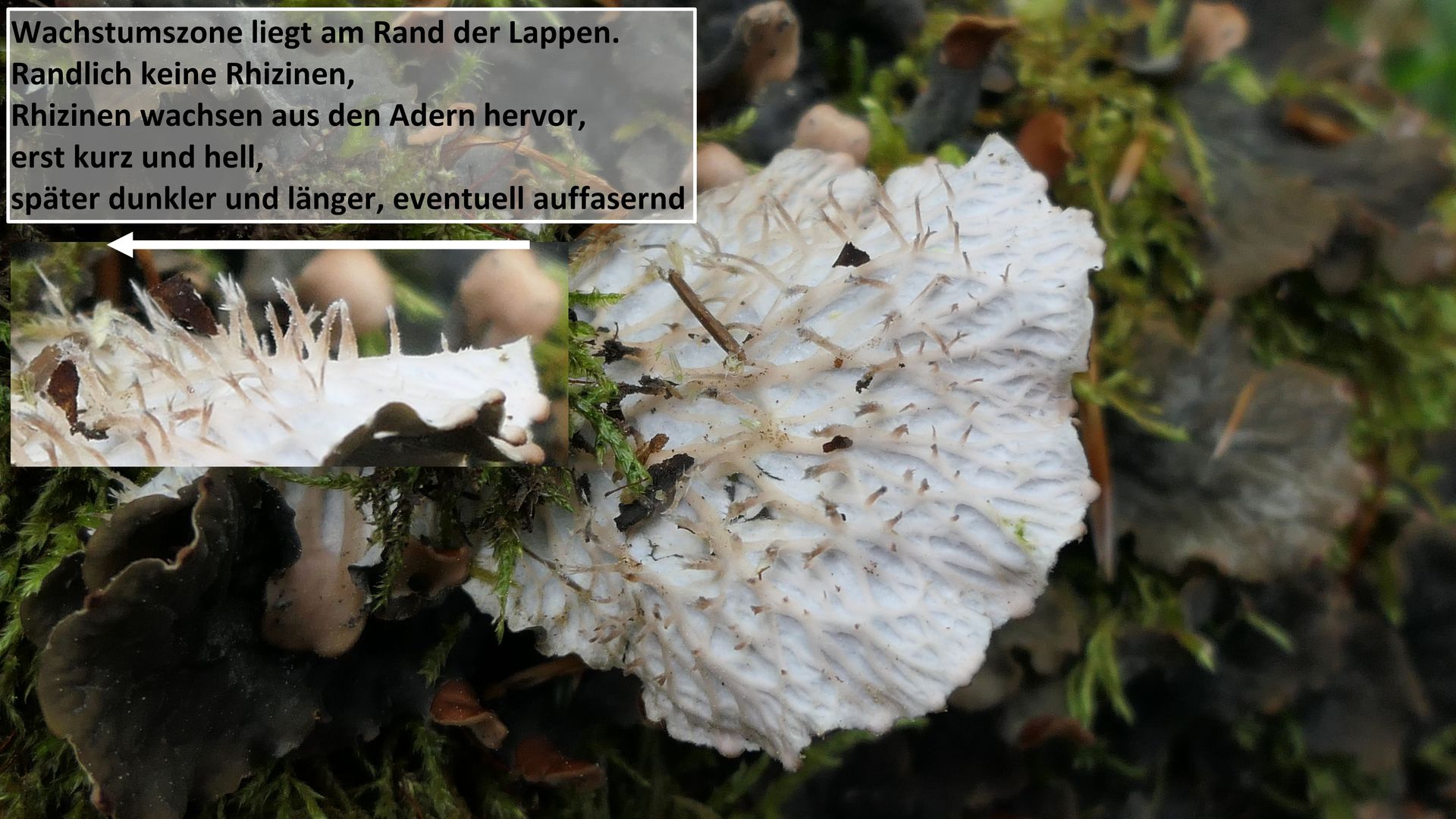 Rhizinen entstehen übrigens nicht am Rand des Lagers, sondern entwickeln sich allmählich aus den Adern auf der Unterseite.