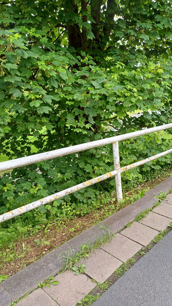 auf abseits gelegenen (lackierten) Stahlgeländern, die in Ruhe gelassen werden, finden sich nach einer Weile Flechten ein.