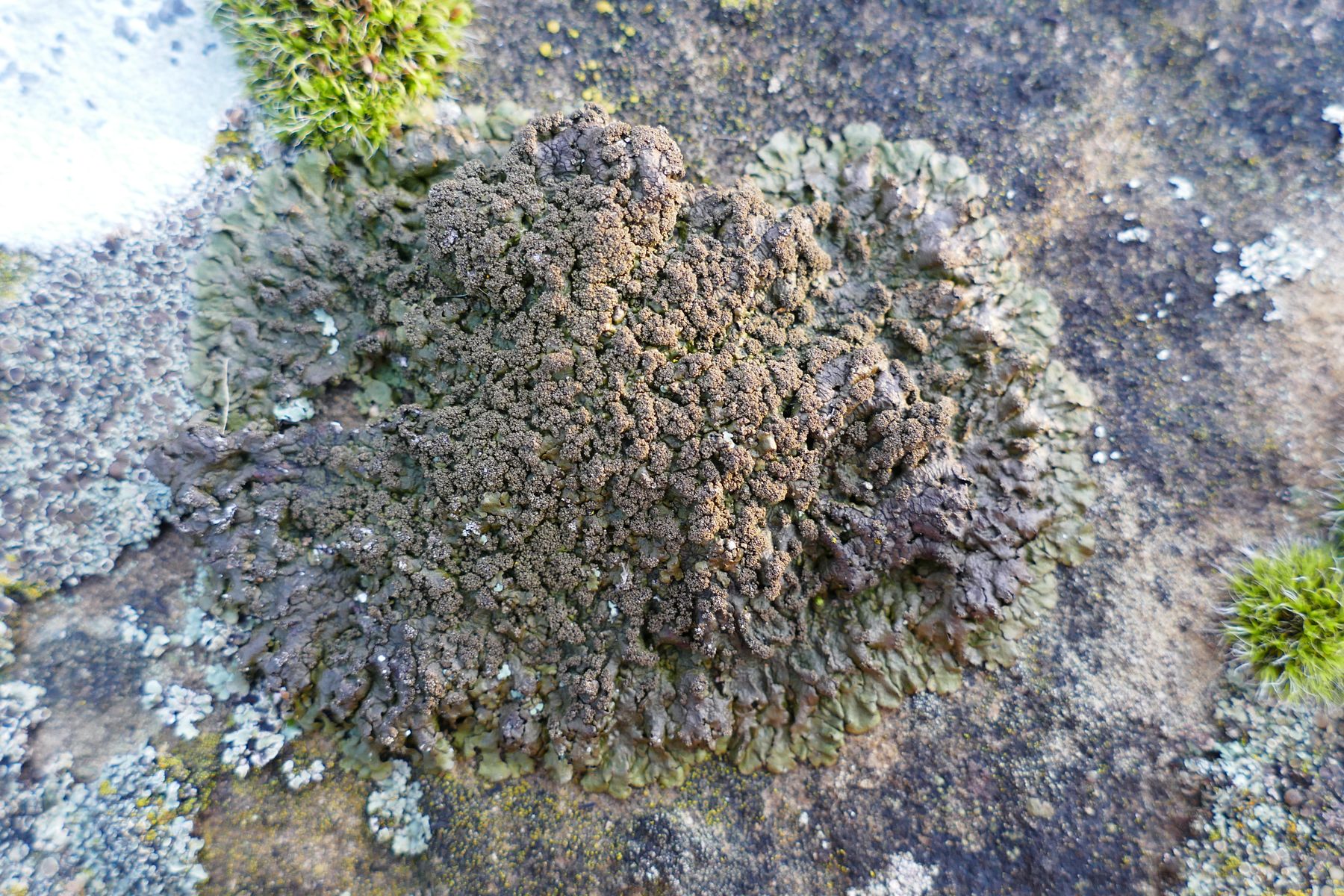 Xanthoparmelia verruculifera liegt nicht so dicht an und hat z.B. große Isidienknäuel; hier ein Beispiel auf einer alten verwitterten Friedhofsmauerkrone aus Sandstein, etwas halbschattig gelegen unter einem Baum: