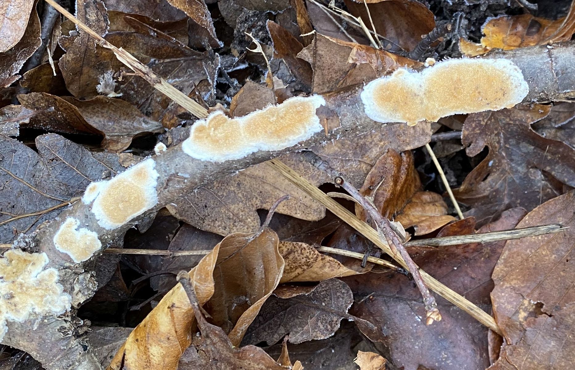 ich habe heute im Rotbuchen- und Eichen-Laubwald einen Ast mit einem Rindenpilz gefunden, der von auffallend schöner Farbe war: Orange in der Mitte und Weiß an den Rändern.